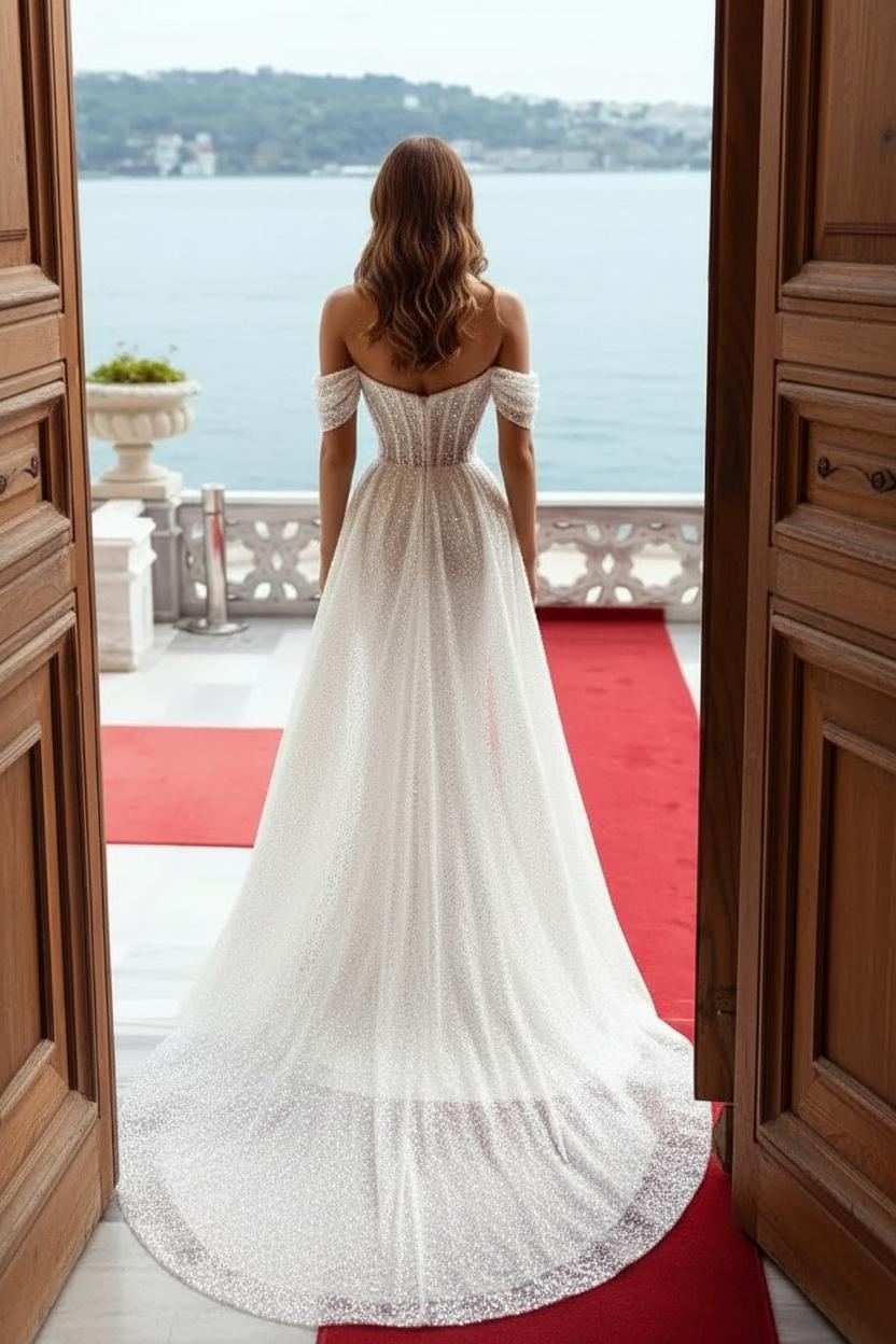 Sparkly Long Sequins Off The Shoulder Mermaid Wedding Dress With Detachable Sweep Train