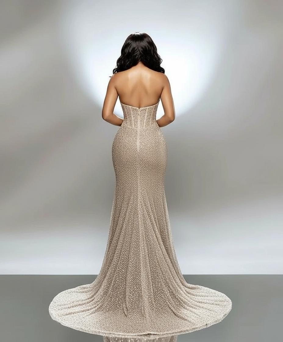 - Floor-length design with elegant sweep train for classic formal beauty and red carpet appeal