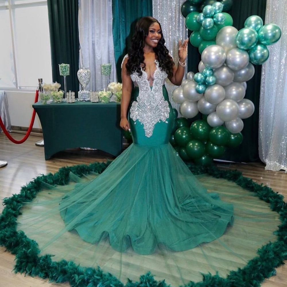 This elegant mermaid prom dress features a charming long V neck with intricate tulle and beading details. The sleeveless design adds a touch of sophistication while the mermaid silhouette enhances your figure. Perfect for any formal event, this dress will make you feel confident and beautiful.