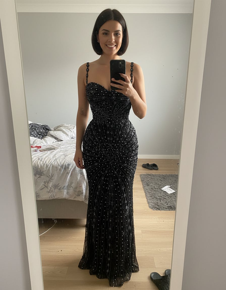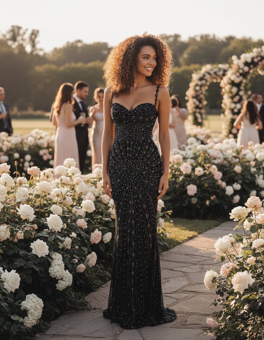 Pair this glamorous black mermaid dress with statement drop earrings or chandelier earrings, a delicate bracelet or cocktail ring, and elegant strappy heels or pointed-toe pumps to complete your red carpet look. The spaghetti straps beautifully showcase your shoulders and decolletage—keep jewelry minimal to let the dress shine. Style with Hollywood waves, a sleek low bun, high ponytail, or glamorous side-swept curls to complement the dramatic silhouette. Coordinates seamlessly with metallic clutches in silver, gold, or crystal, and pairs beautifully with classic red lip makeup or soft glam beauty looks.