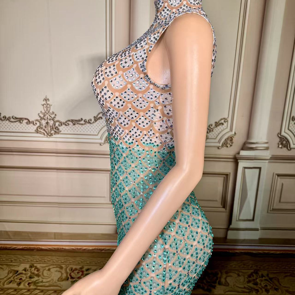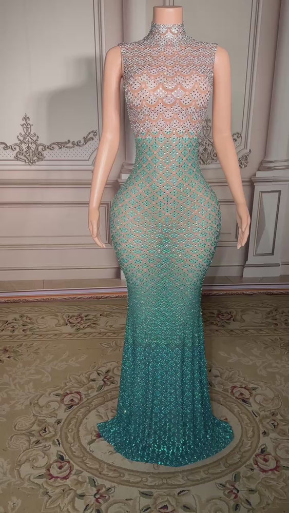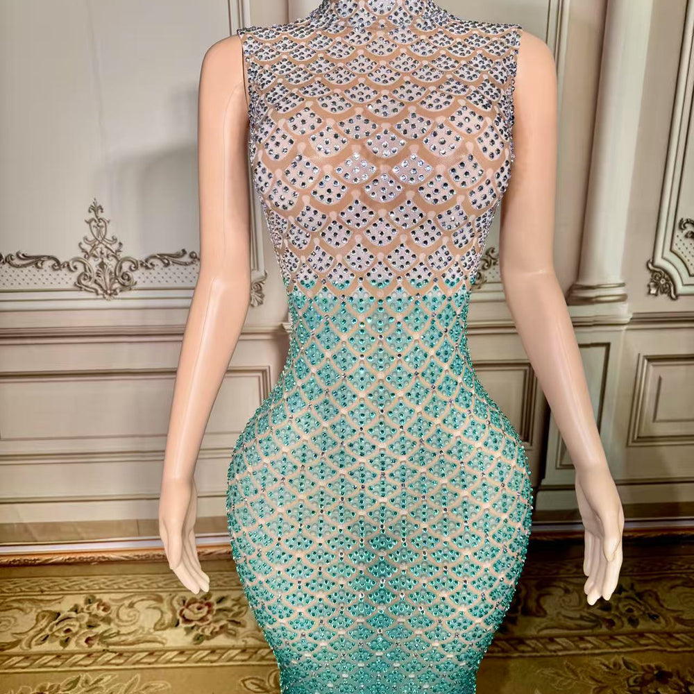 Tulle Illusion High Neck Sleeveless Sheath Prom Dress with Diamonds features sheer tulle detail, a sleek silhouette, and sparkling diamonds, creating a modern, elegant look perfect for any special night.