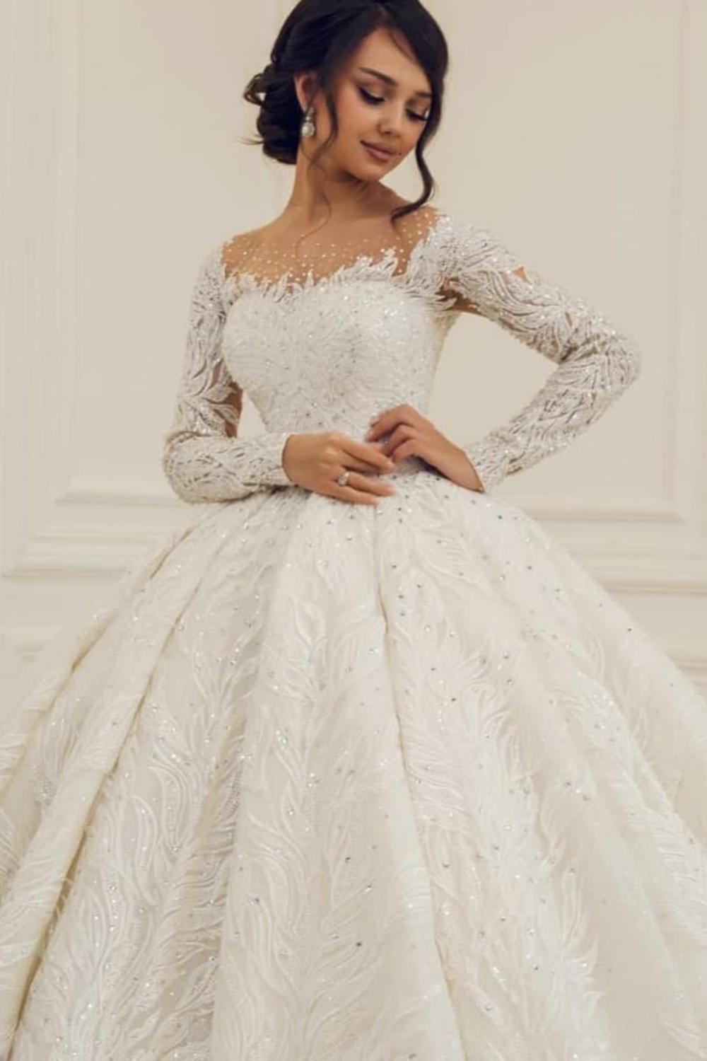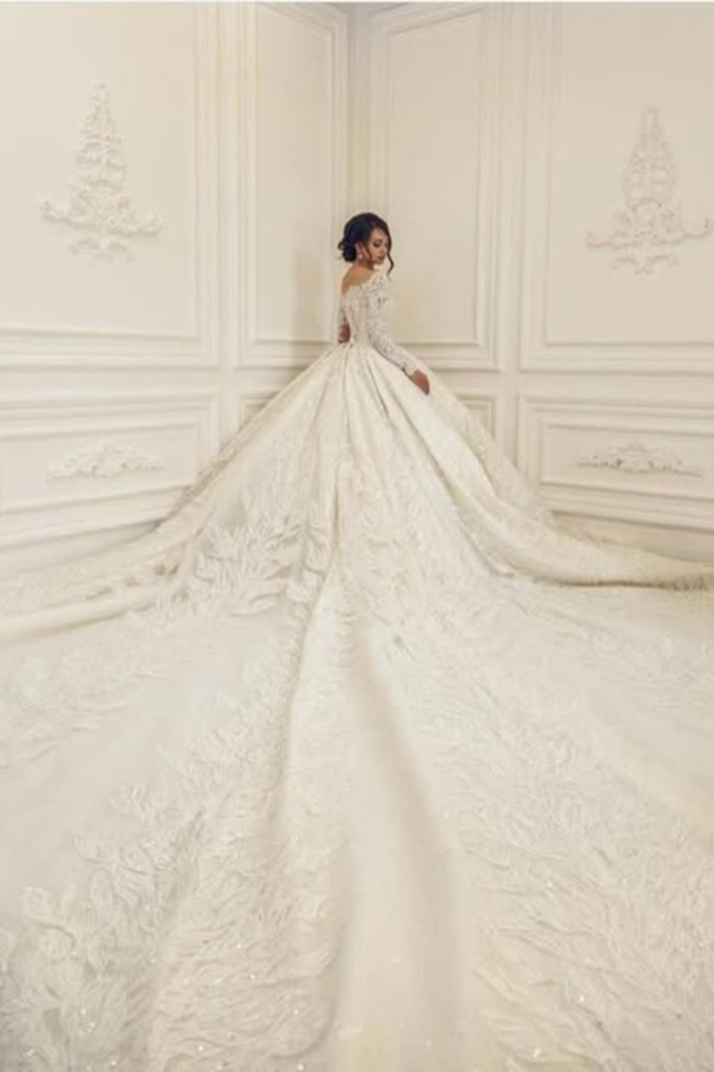 Embrace timeless elegance with this luxurious off-the-shoulder ball gown wedding dress. Designed with long sleeves and a voluminous skirt, it exudes royal sophistication while providing graceful coverage. The fitted bodice enhances your silhouette, while the flowing layers create a stunning fairytale look—perfect for grand ceremonies and unforgettable entrances.
