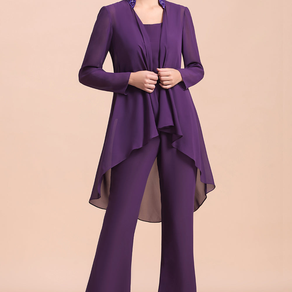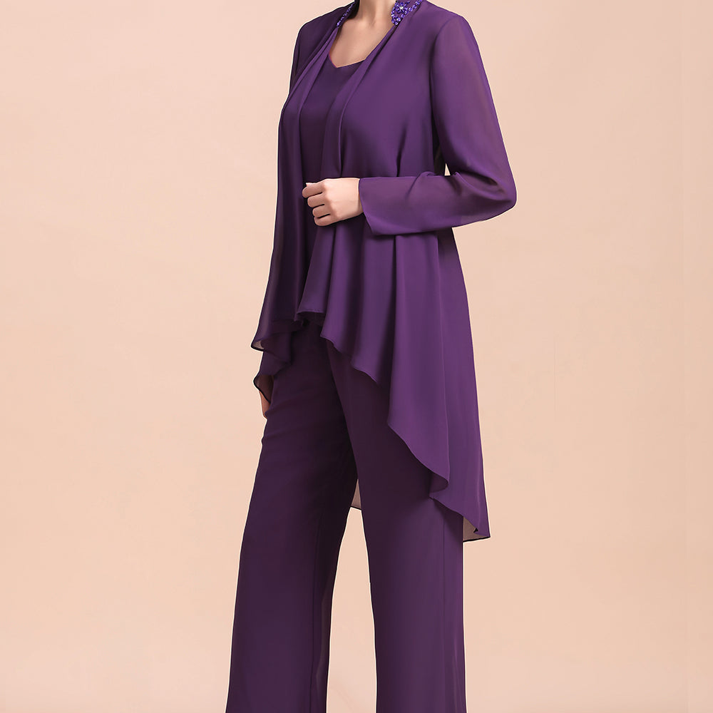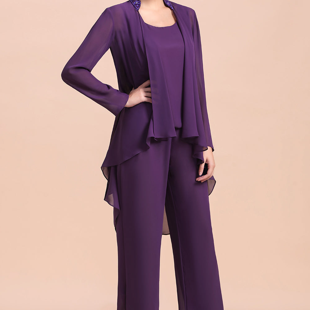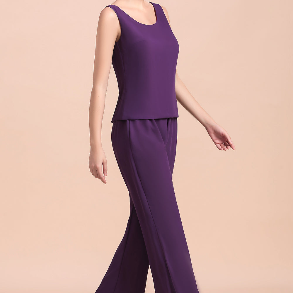 Purple Crew Neck Mother of Bride Dress Jumpsuit with Jacket features a flattering crew neckline, elegant wide-leg pants, and a matching chiffon jacket. This stylish jumpsuit offers comfort, coverage, and sophistication for a special celebration.