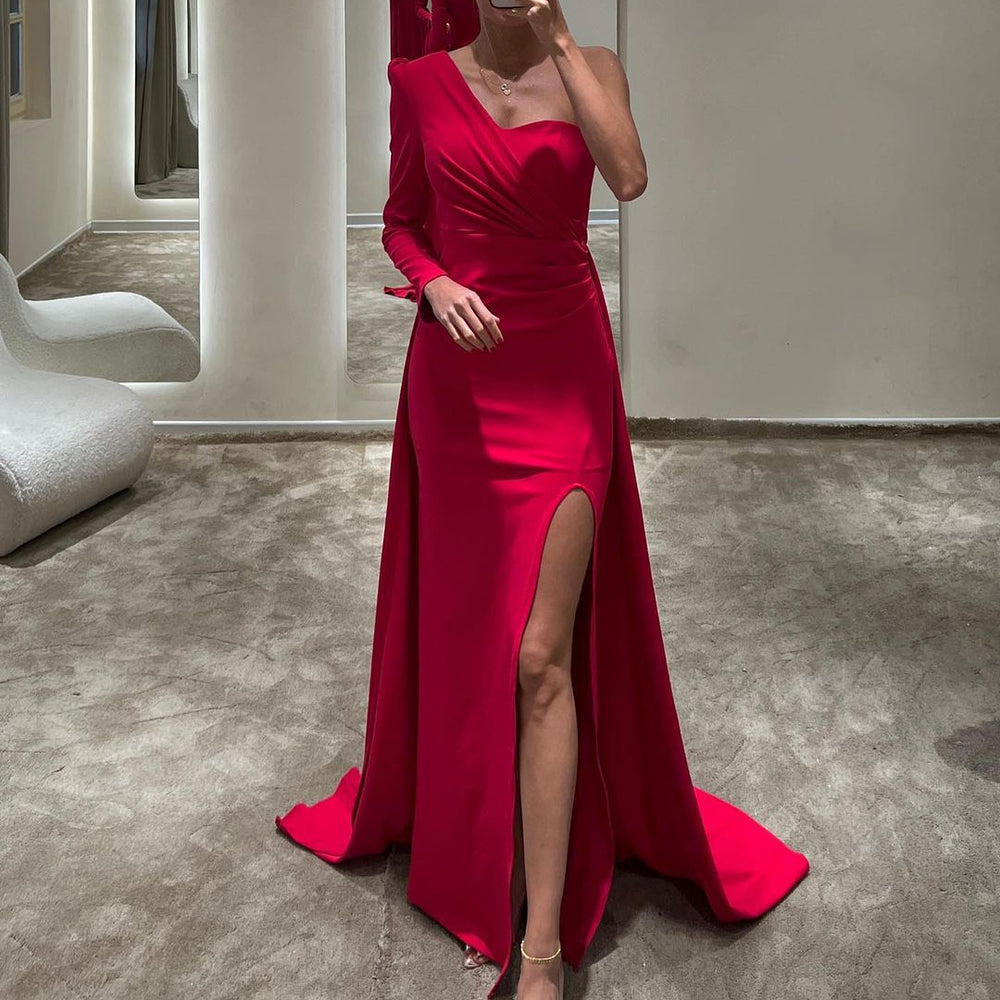 Elegant Red Long Sleeves Mermaid One Shoulder Satin Prom Dress with Front Split