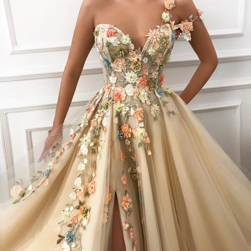 Attractive A-line One Shoulder Tulle Long Prom Dress with Slit