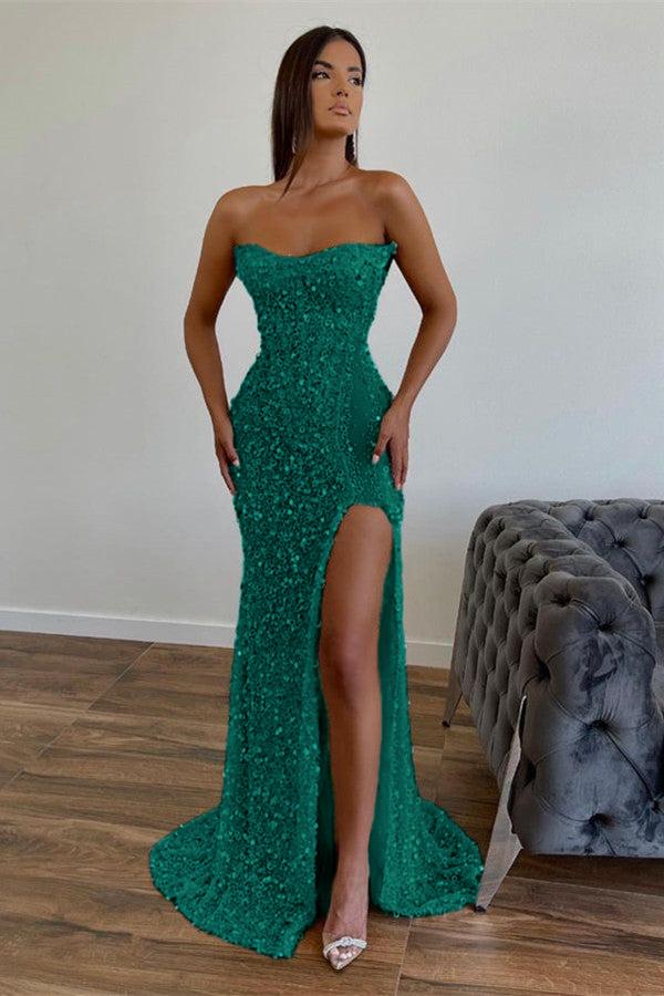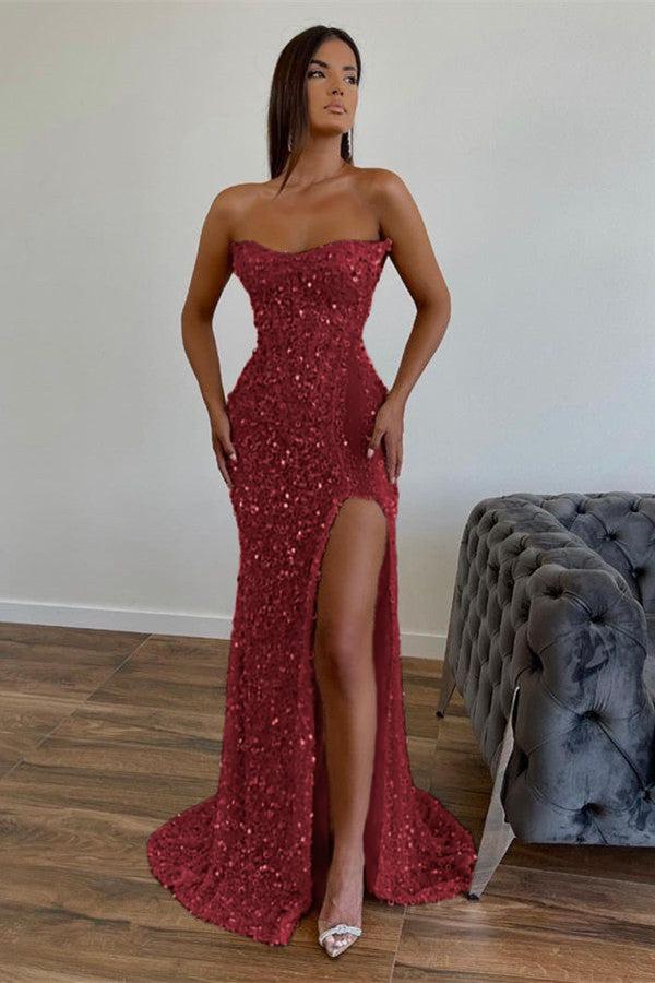 Biztunnel Chic Long Mermaid Strapless Sequined Prom Dress with Slit