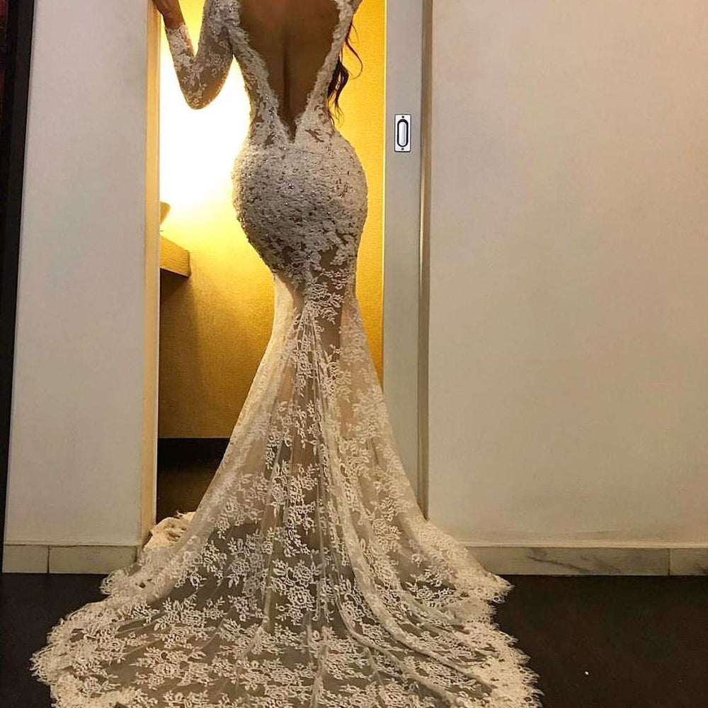 Long Sleeves White Mermaid V-neck Lace Formal Prom Dress with Slit