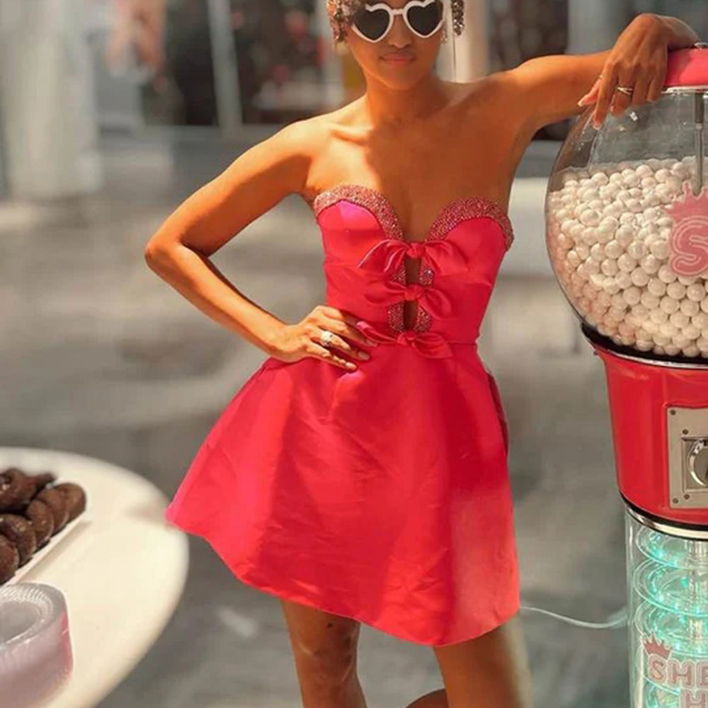 Sparkly A-Line Black Strapless Satin Short Homecoming Dress with Bow