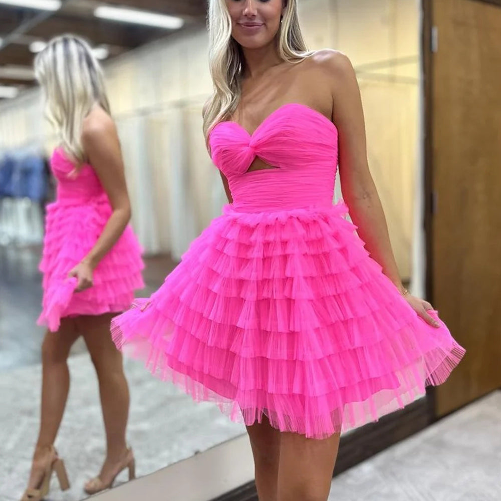 A-Line Fuchsia Strapless Tiered Tulle Short Homecoming Dress with Keyhole