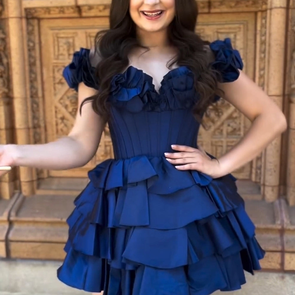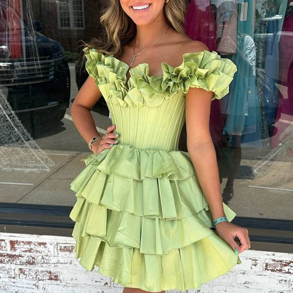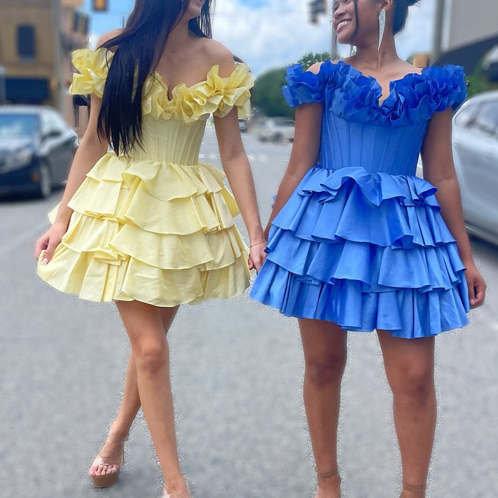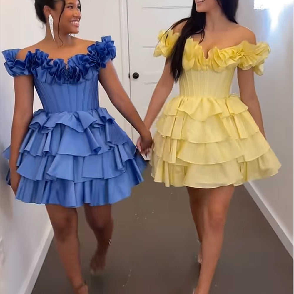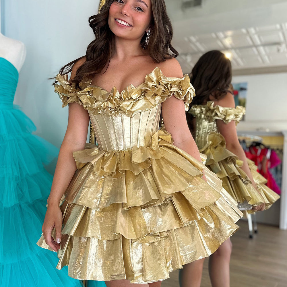 A -Line Off The Shoulder Golden Corset Short Homecoming Dress with Ruffles