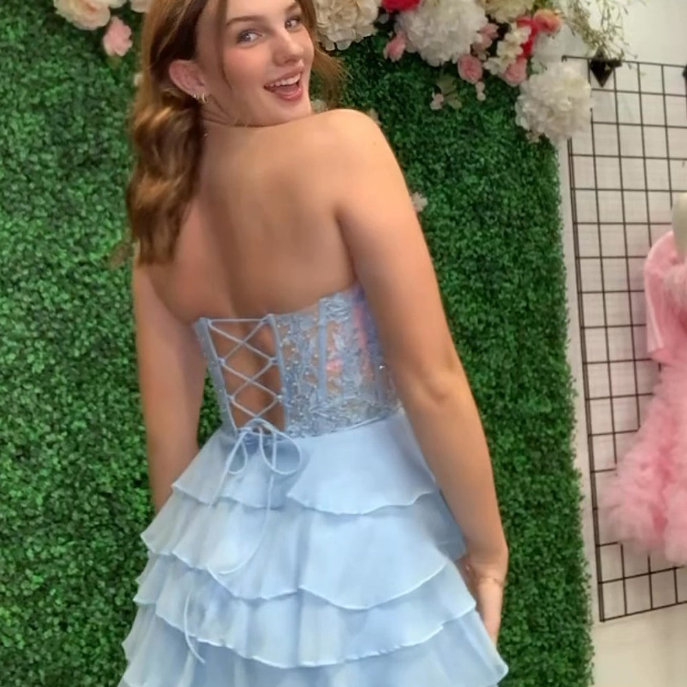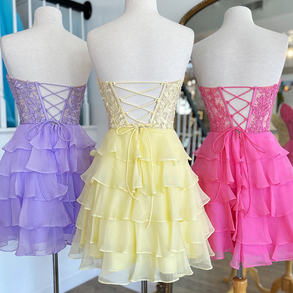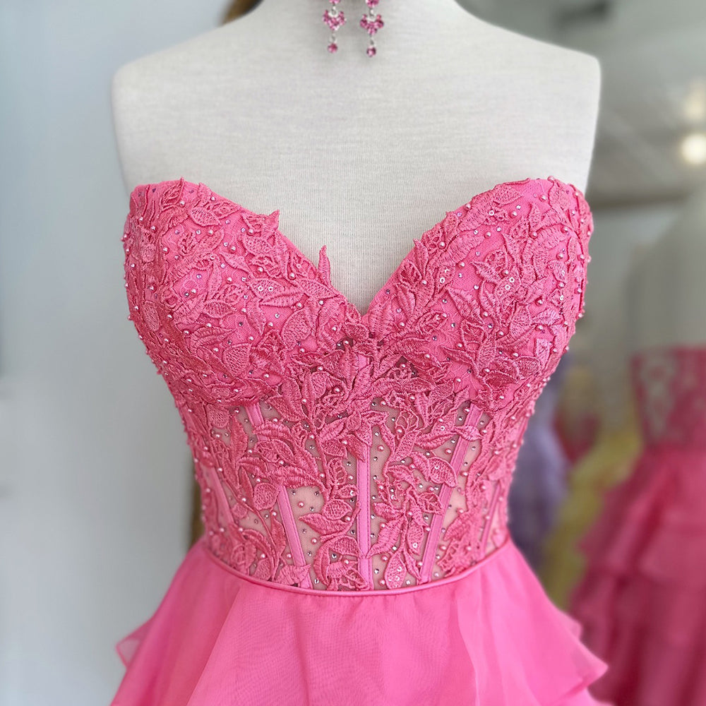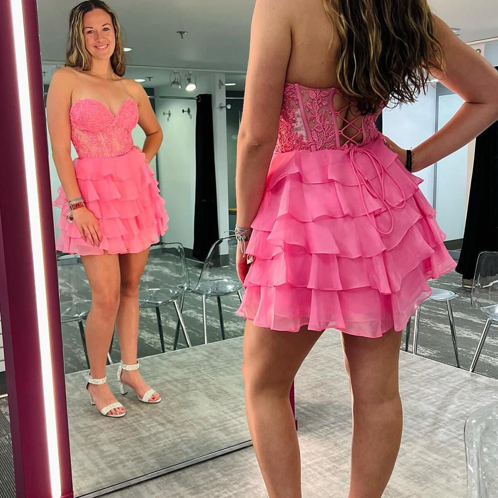 Sparkly A Line Pink Strapless Corset Short Homecoming Dress with Ruffles