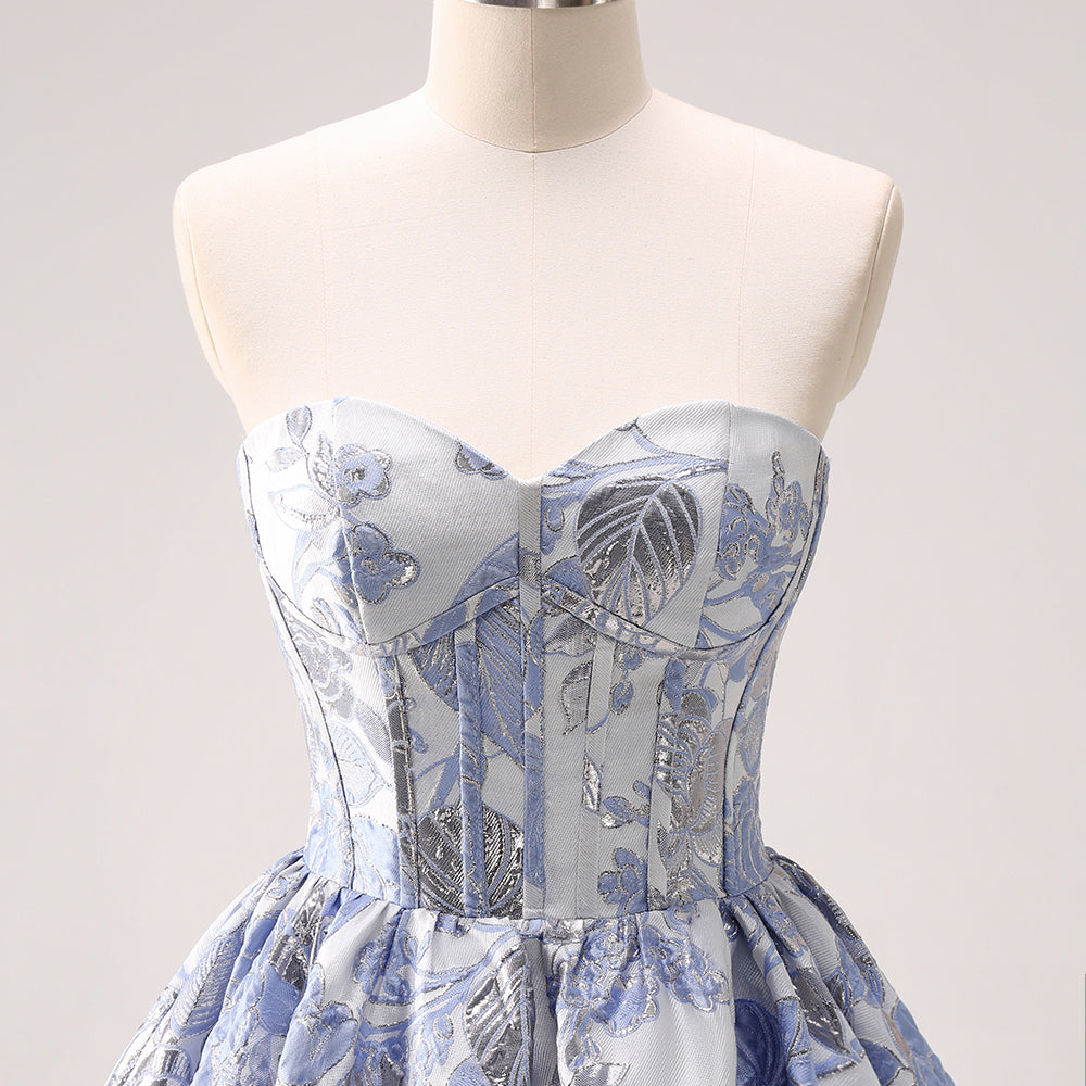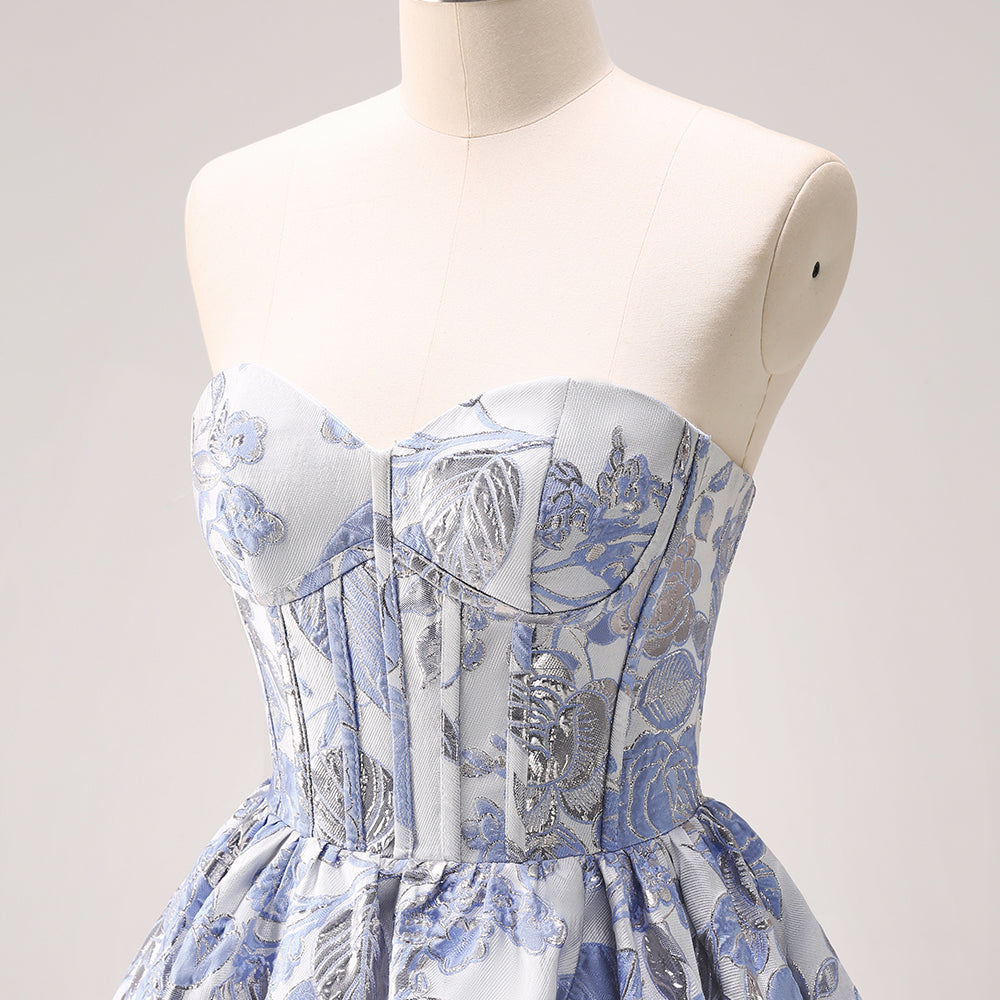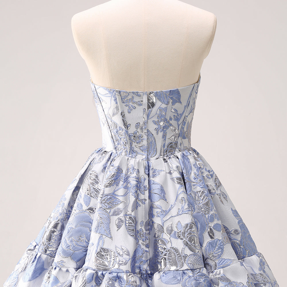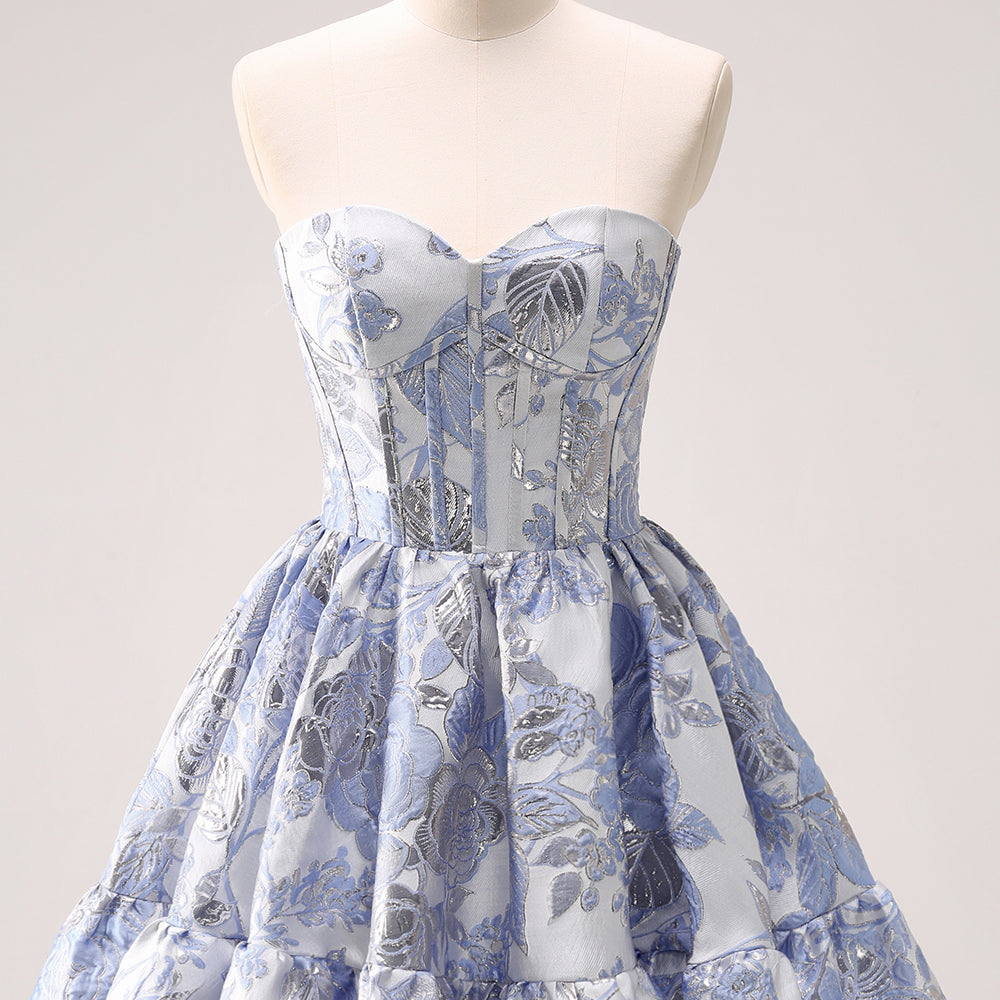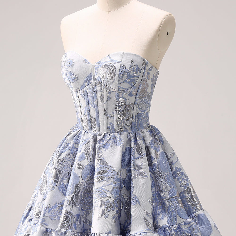 Fluffy Blue Floral Corset Strapless A Line Short Homecoming Dress