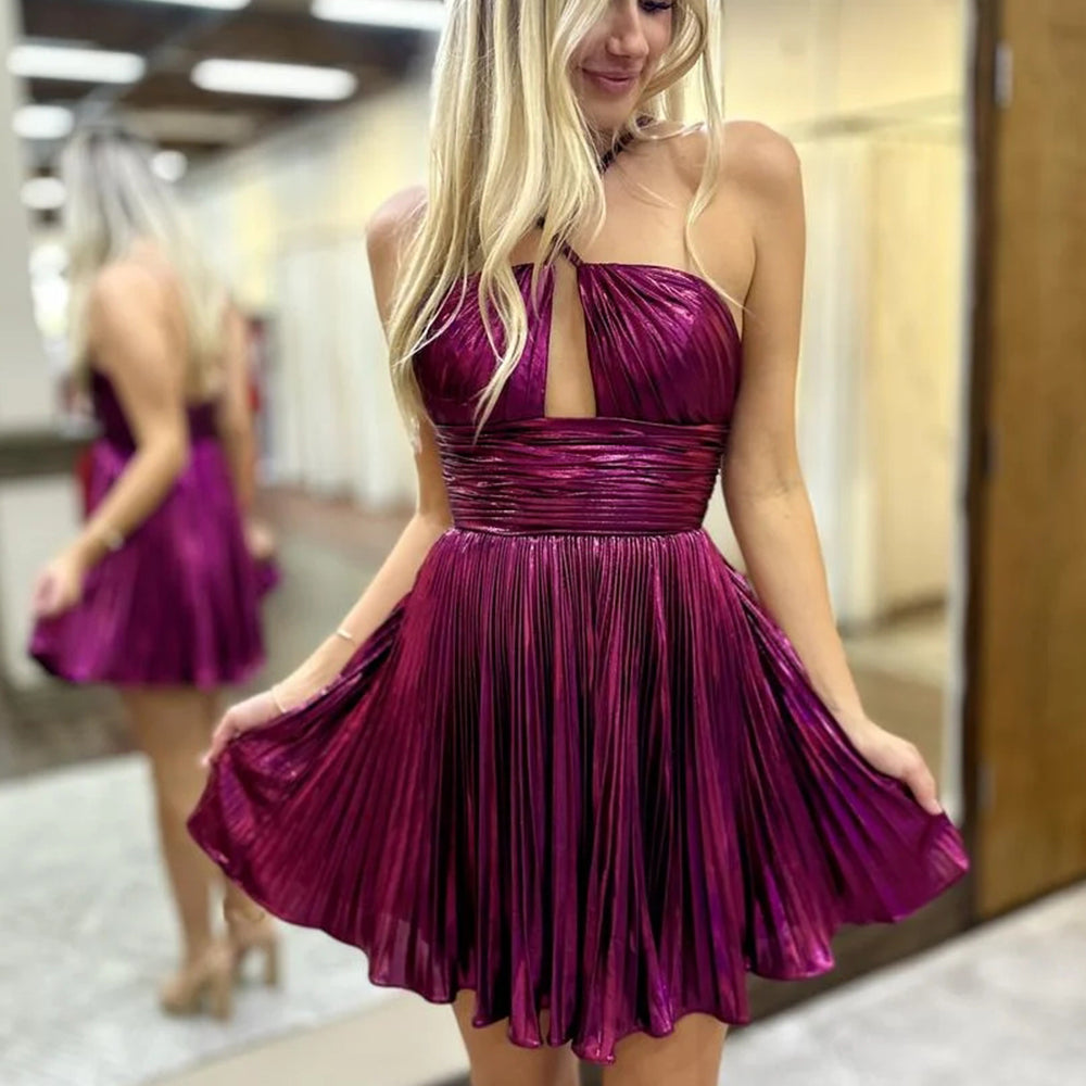 Fuchsia A-Line Metallic Short Pleated Homecoming Dress