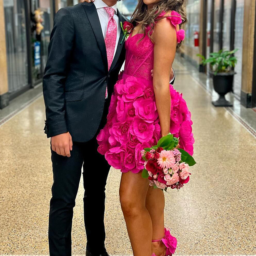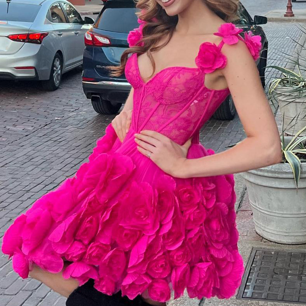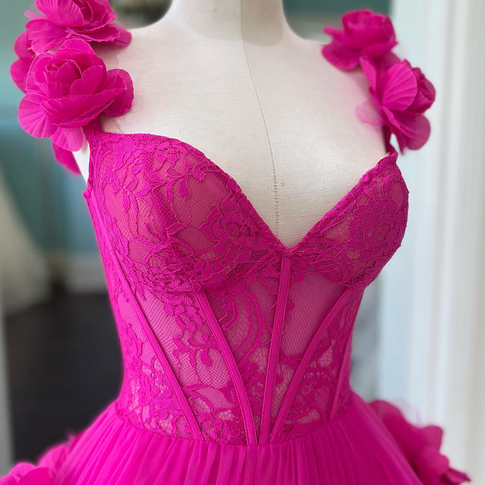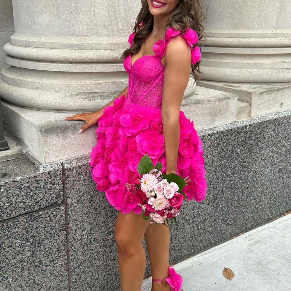 Fuchsia Corset Floral Ruffled Short Homecoming Dress with Lace