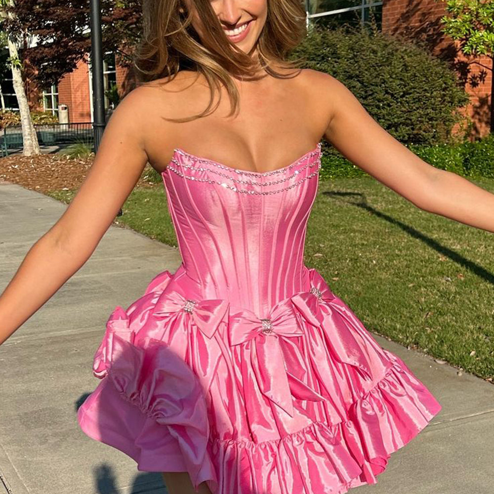 Pink A Line Corset Strapless Short Homecoming Dress With Bows