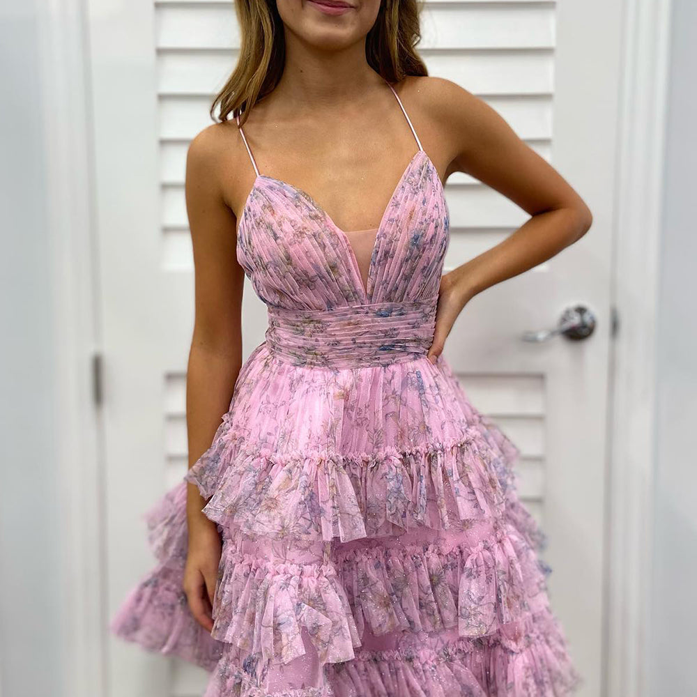 Pink A Line Ruffled Spaghetti Straps Short Homecoming Dress