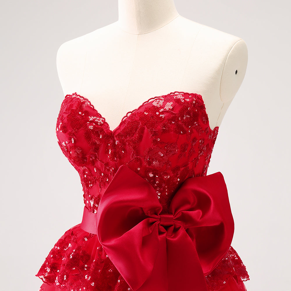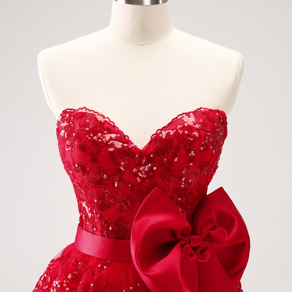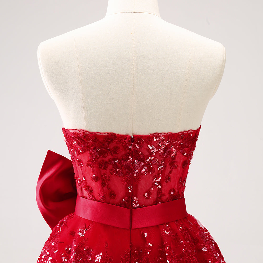 Red Sparkly Strapless A Line Short Homecoming Dress with Bow