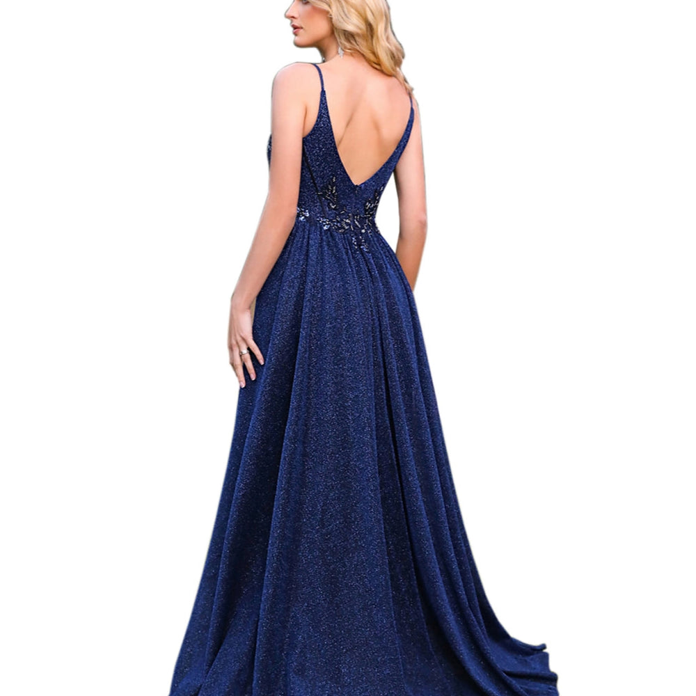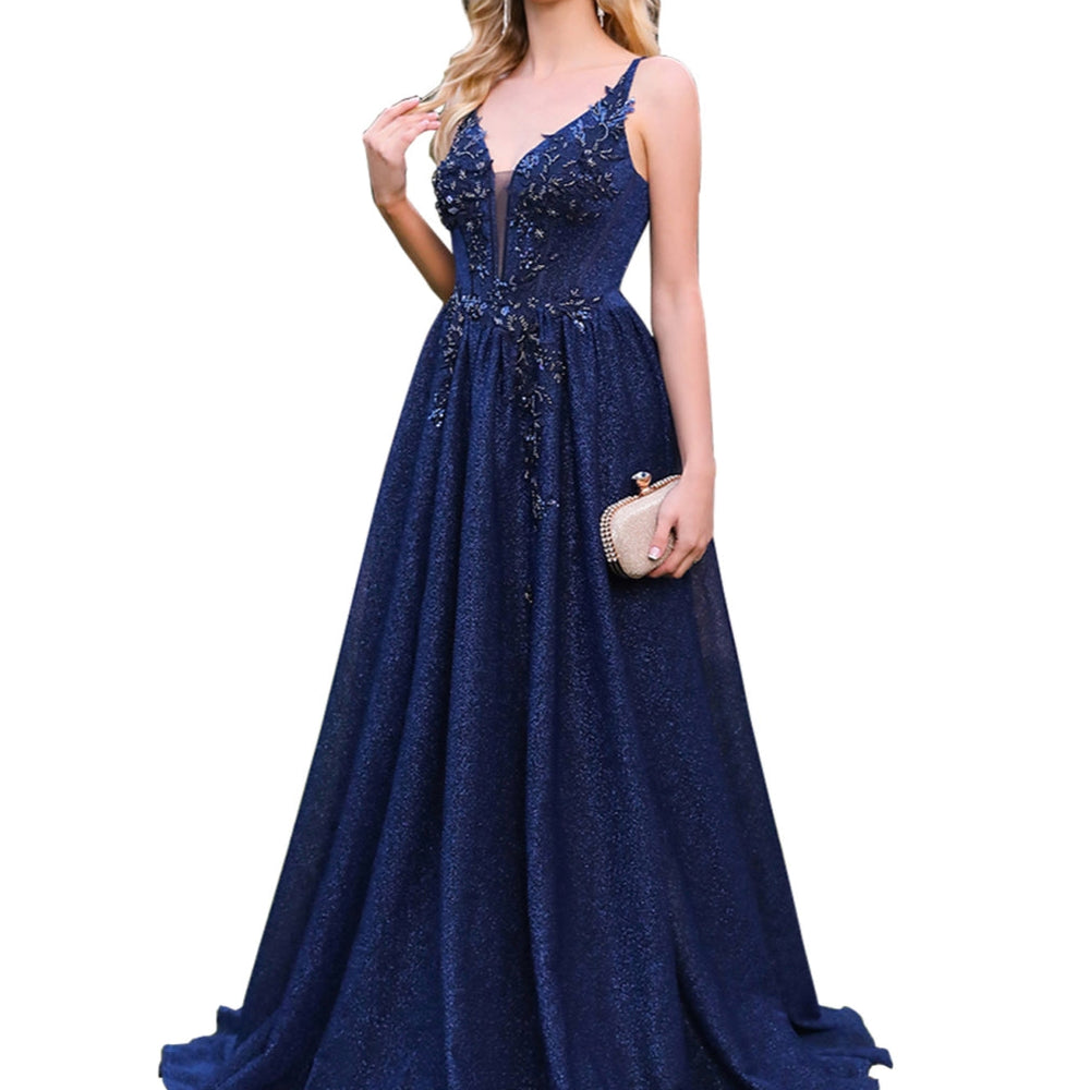 Expertly crafted in an elegant dark navy color, this A-line prom dress features a flattering v-neckline and sparkling glitter beadings. The floor length design and intricately detailed appliques create a timeless and sophisticated look. Perfect for making a statement at any formal event.