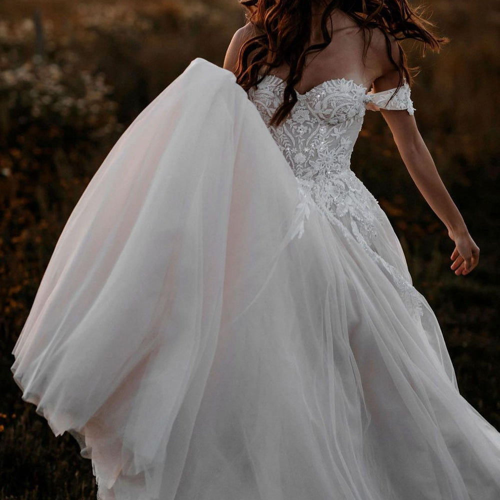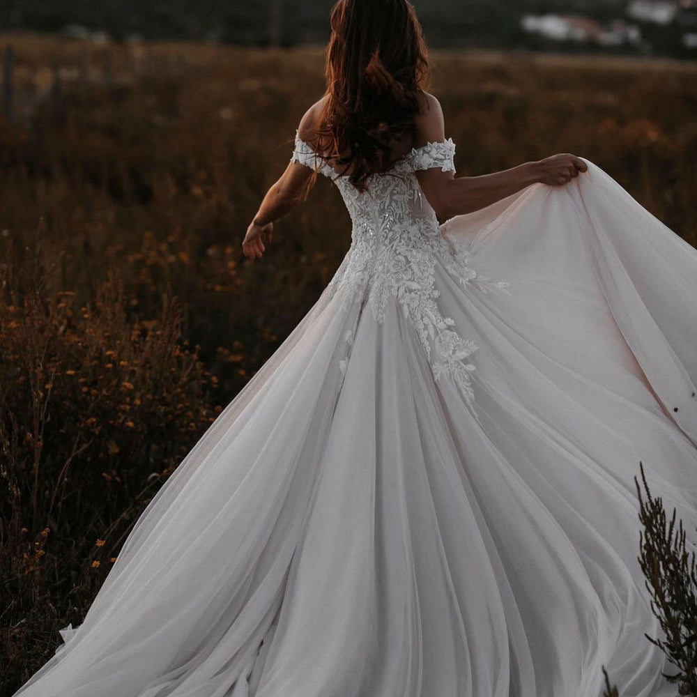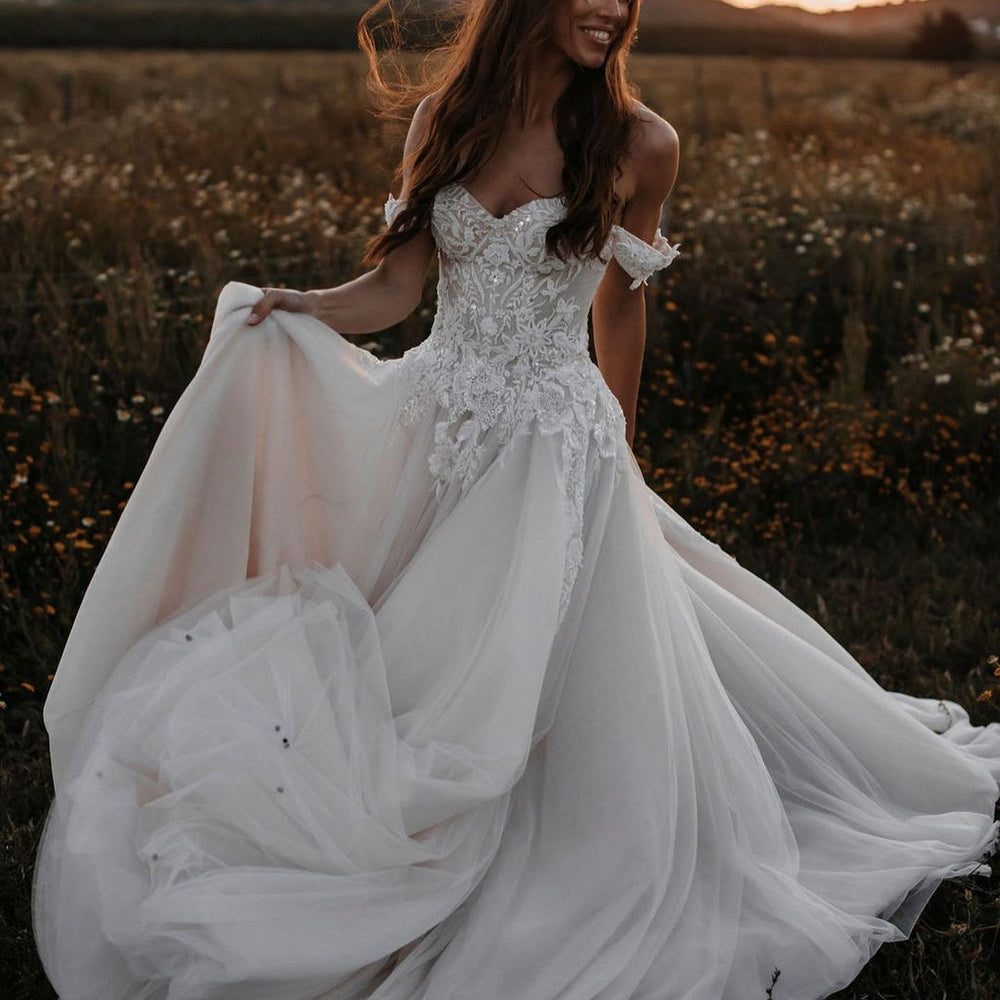 Gorgeous Long A-line Off-the-shoulder Tulle Wedding Dress with Appliques Lace