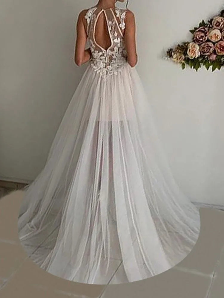 Unique A-line High Neck Lace Tulle Long Wedding Dresses with Slit