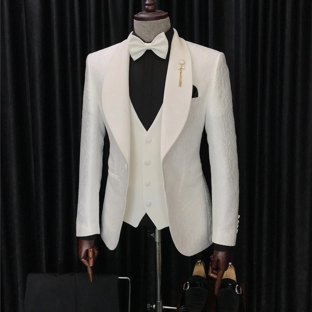 Cryil Bespoke White Three Pieces Shawl Lapel Jacquard Wedding Suits For Men