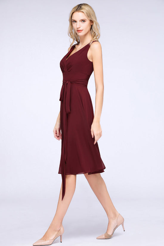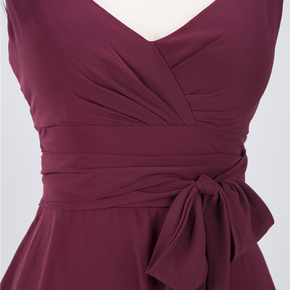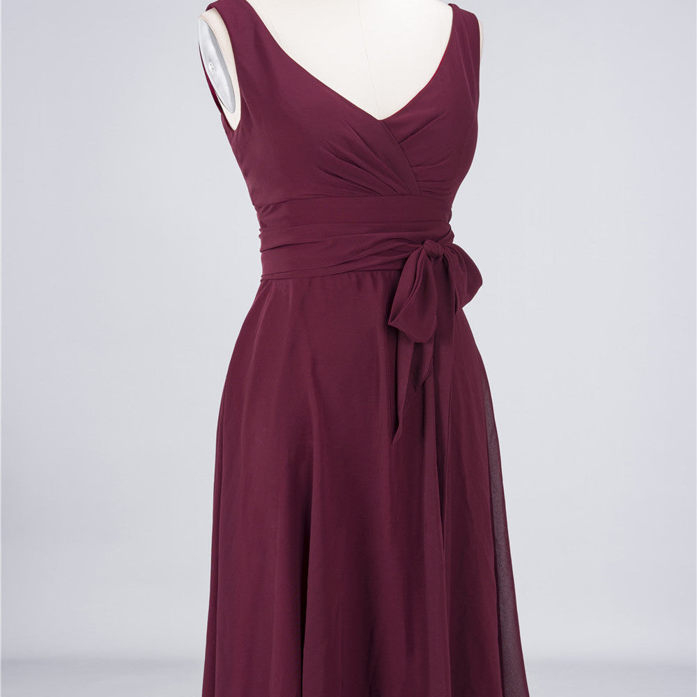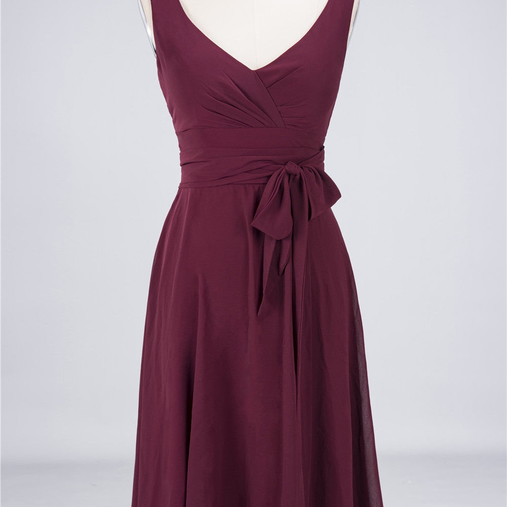 A-Line Chiffon Straps V-Neck Short Bridesmaid Dress with Bow Sash