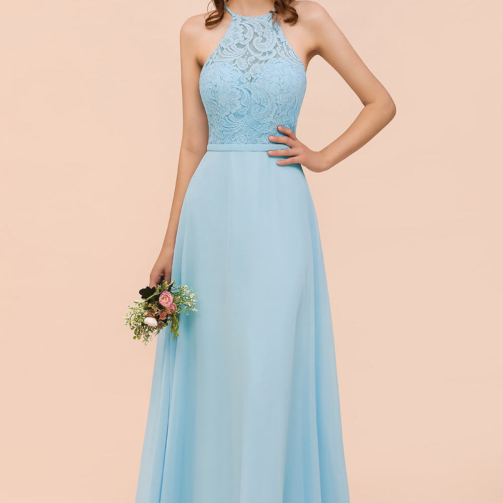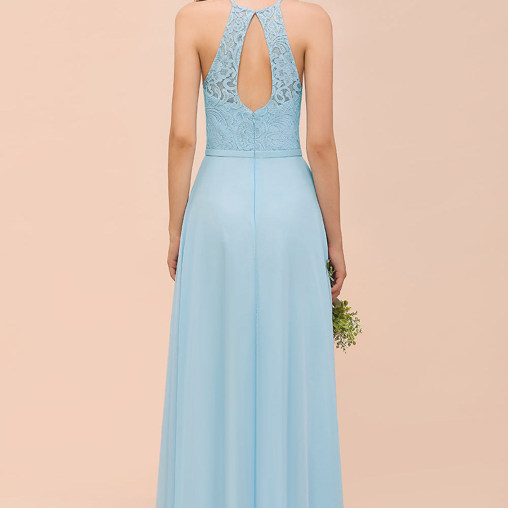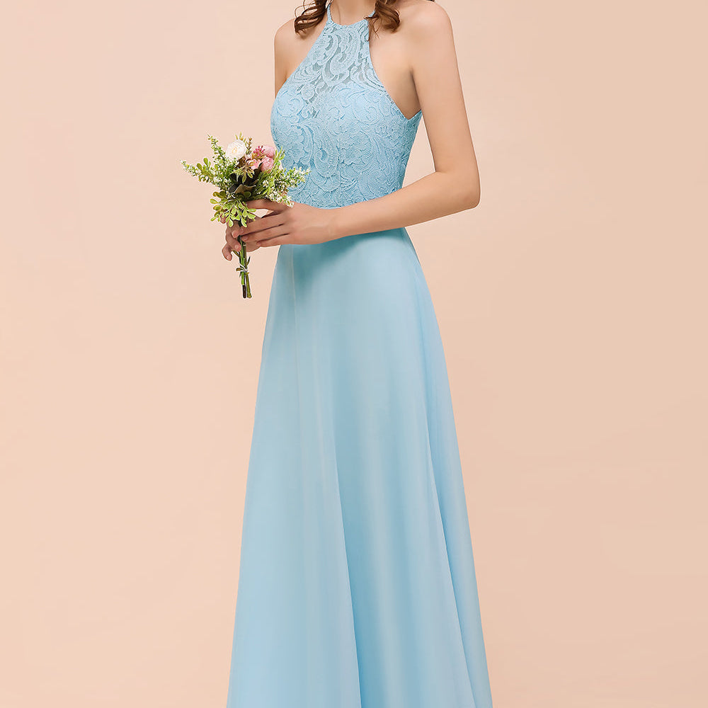 A-Line Halter Appliques Chiffon Long Bridesmaid Dress Sky Blue Party Dress