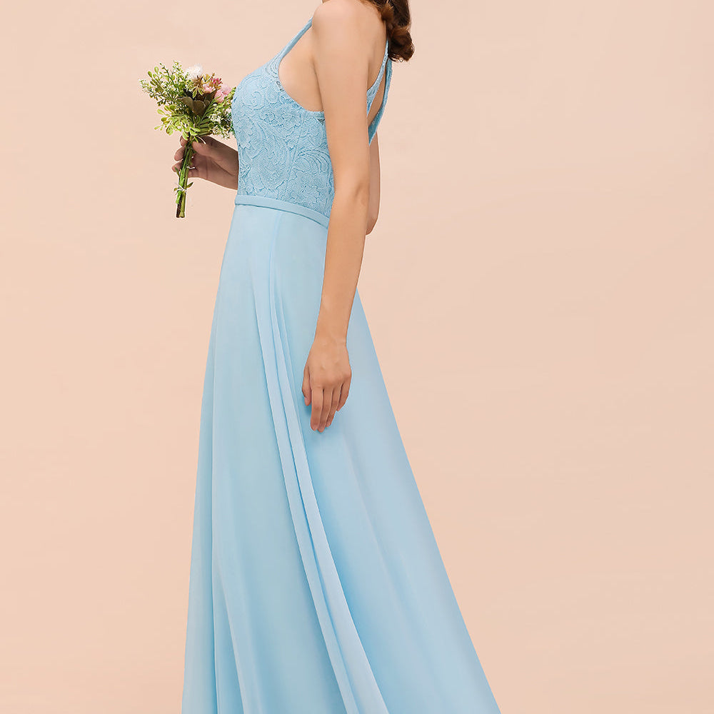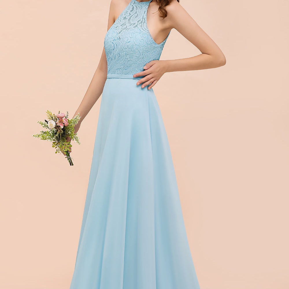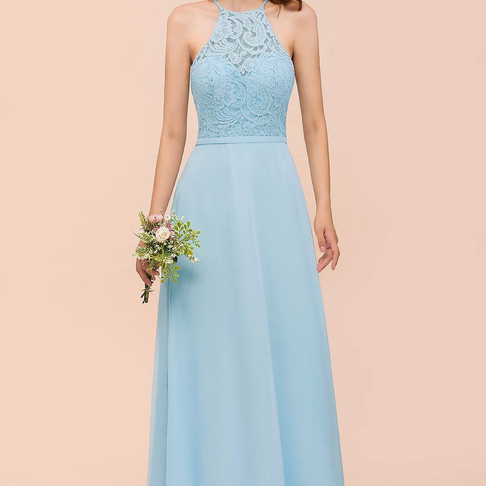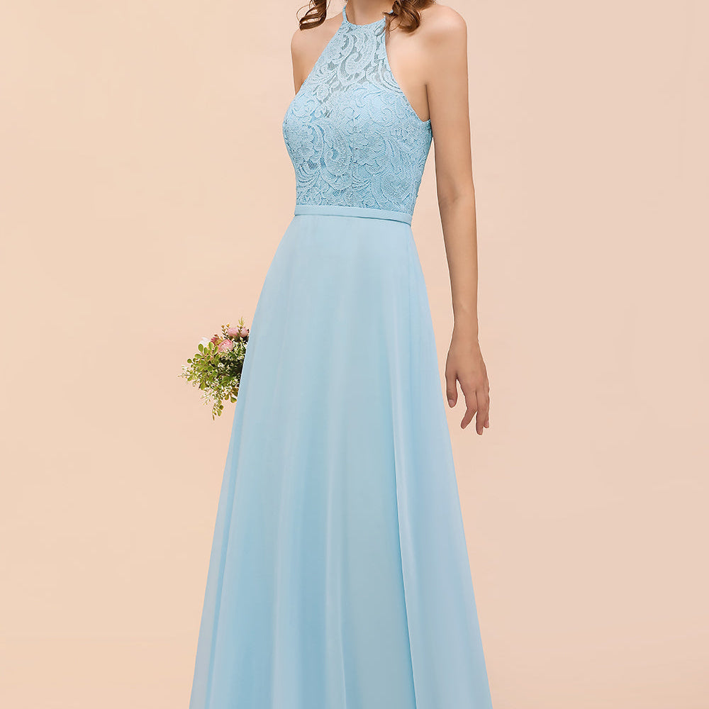 A-Line Halter Appliques Chiffon Long Bridesmaid Dress Sky Blue Party Dress