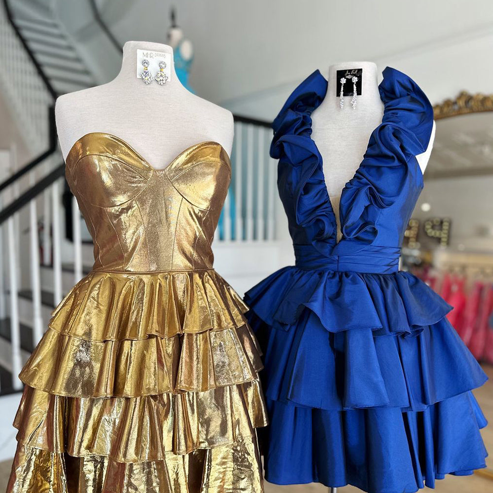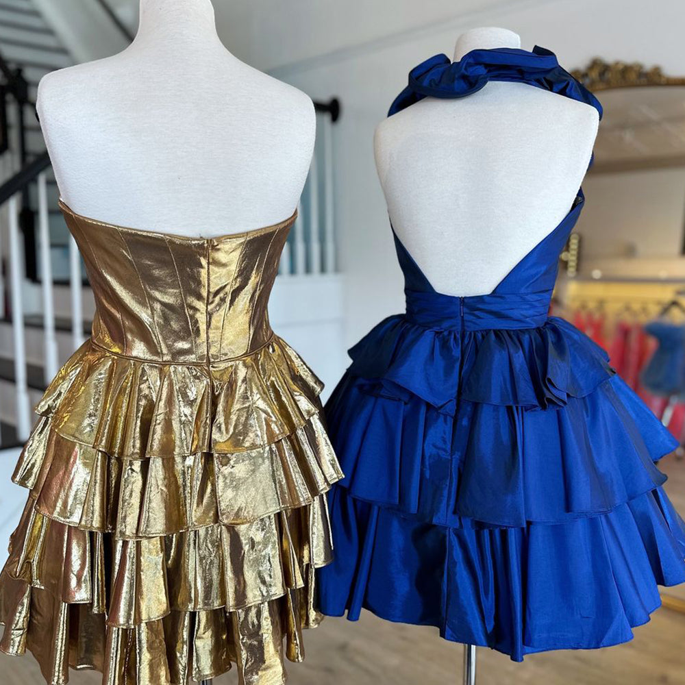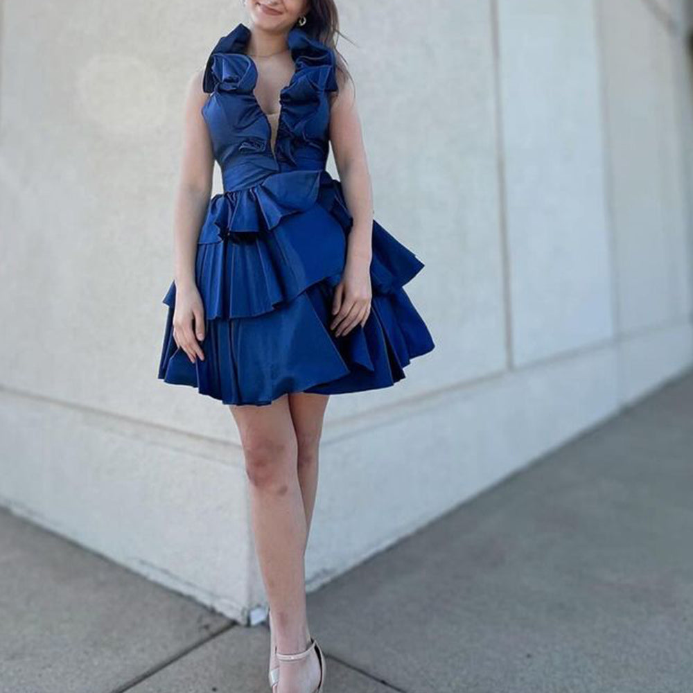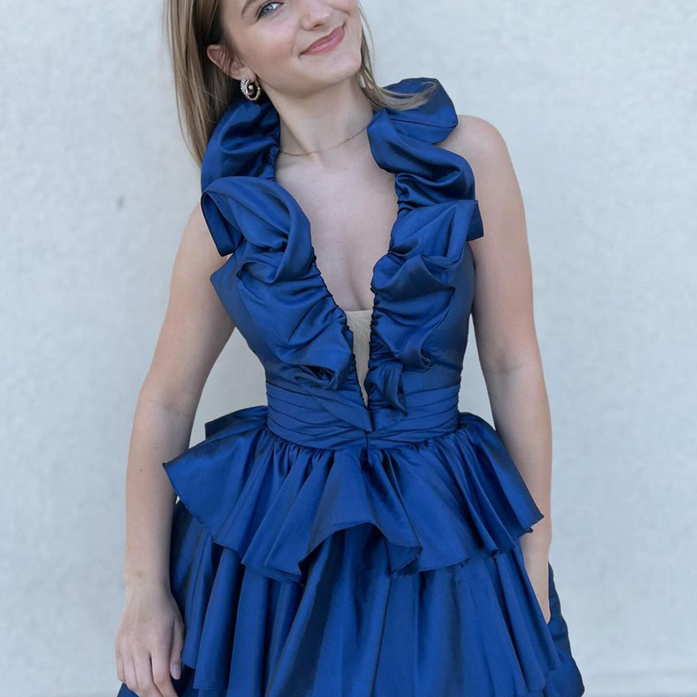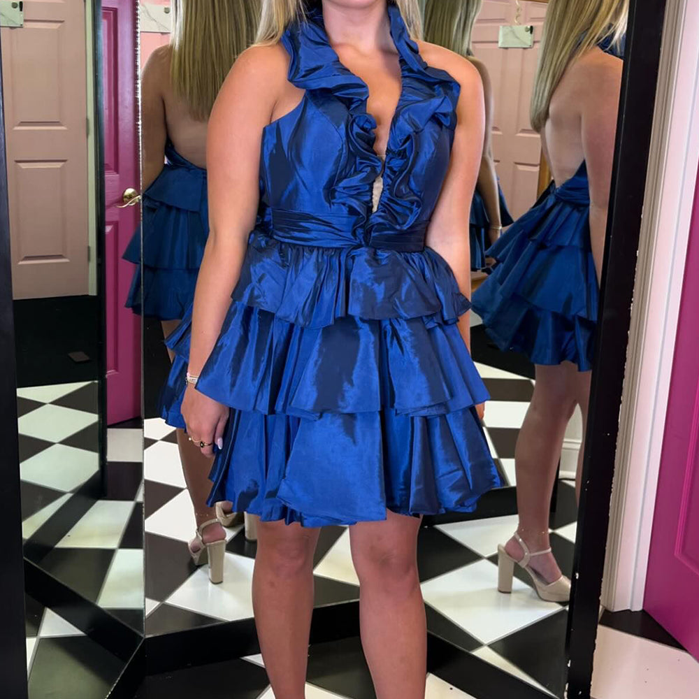 A Line Light Blue Halter Short Homecoming Dress With Ruffles