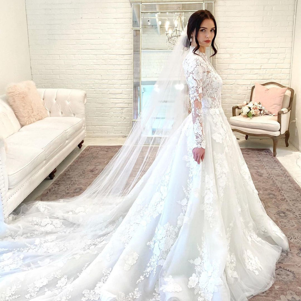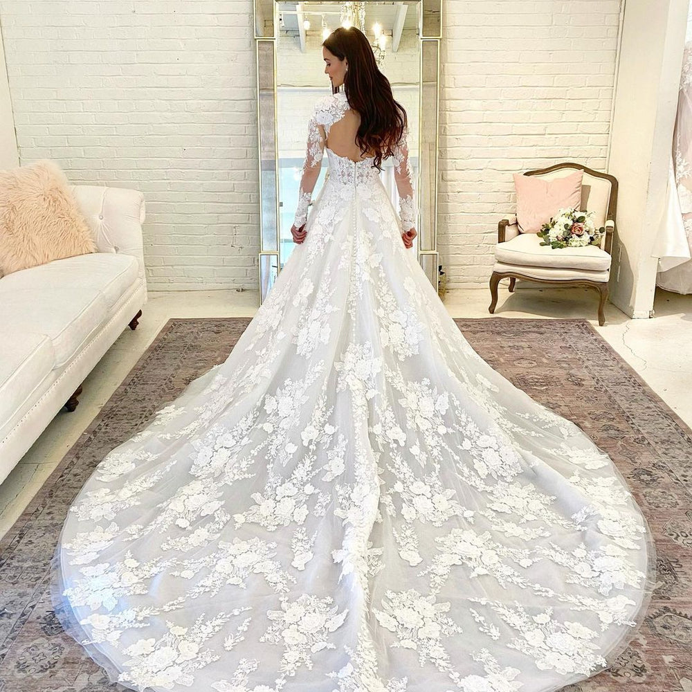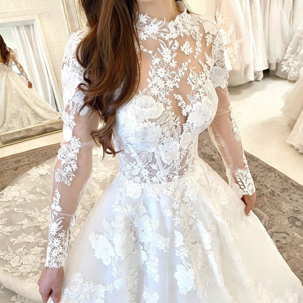 Beautiful Long A-line High Neck Lace Open Back Wedding Dress with Sleeves