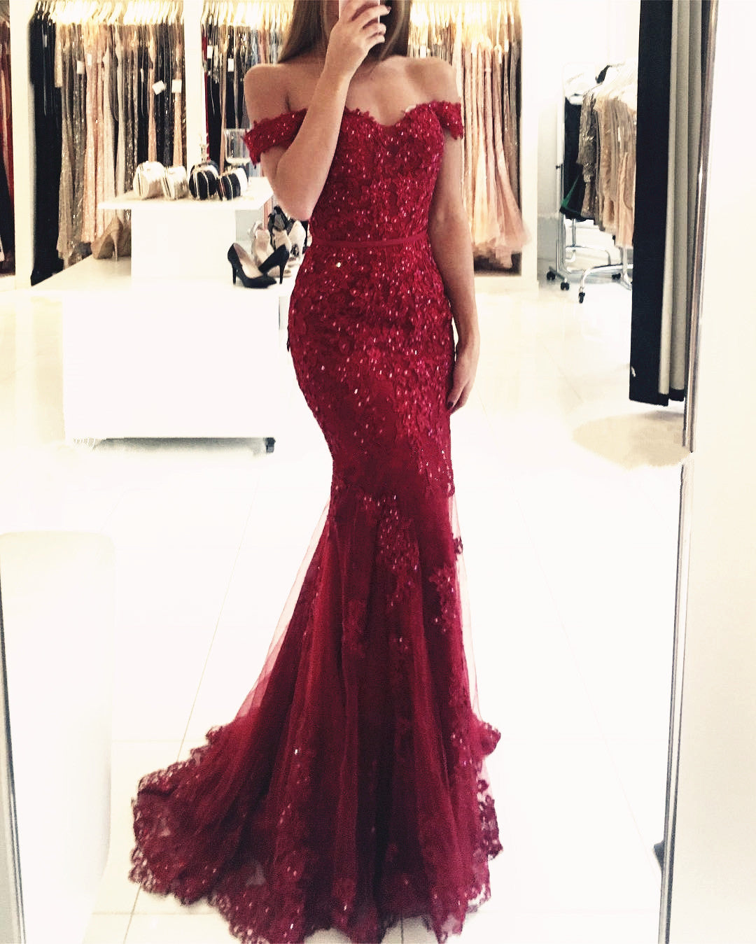 This stunning burgundy long mermaid off the shoulder dress will make you feel like a true prom queen. Made from high-quality tulle fabric, it features intricate beaded lace details that add a touch of elegance. The figure-hugging mermaid silhouette will flatter your curves and make you stand out at any event.