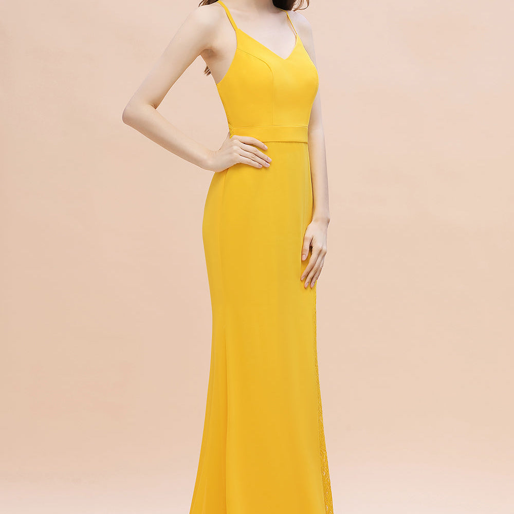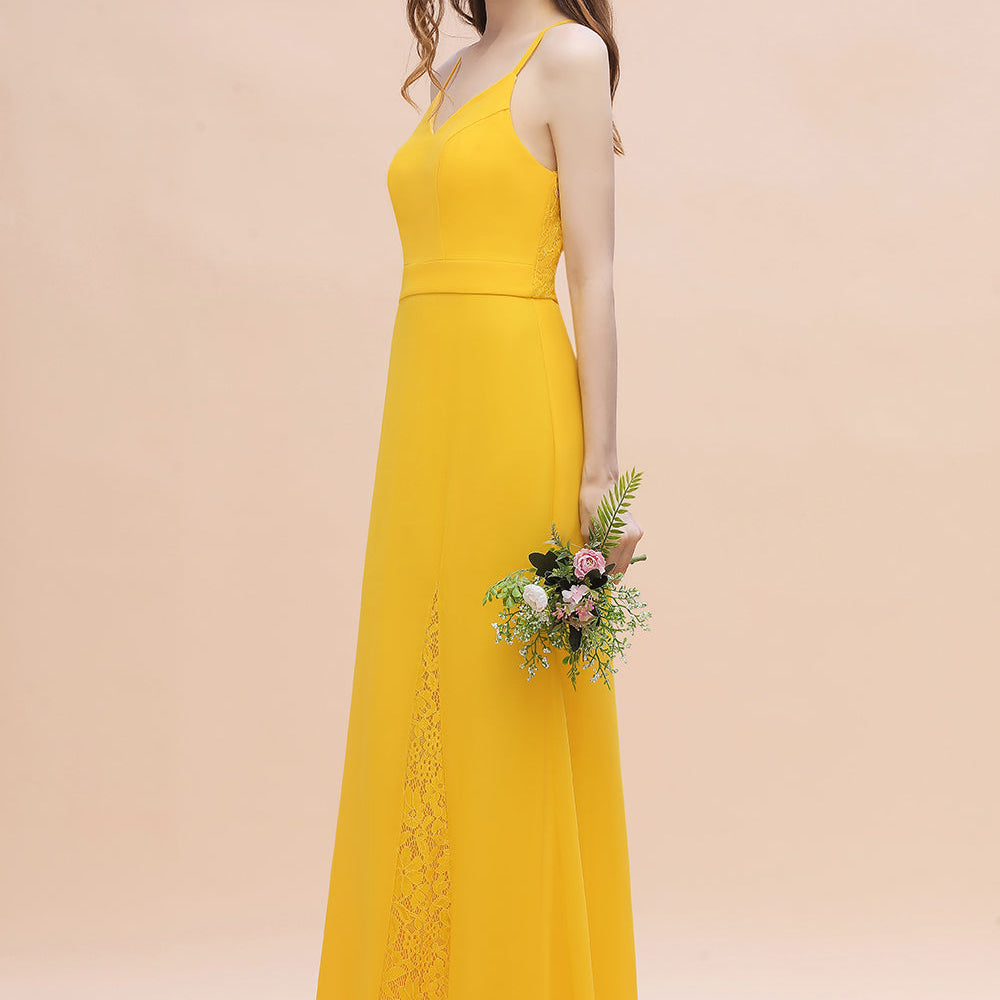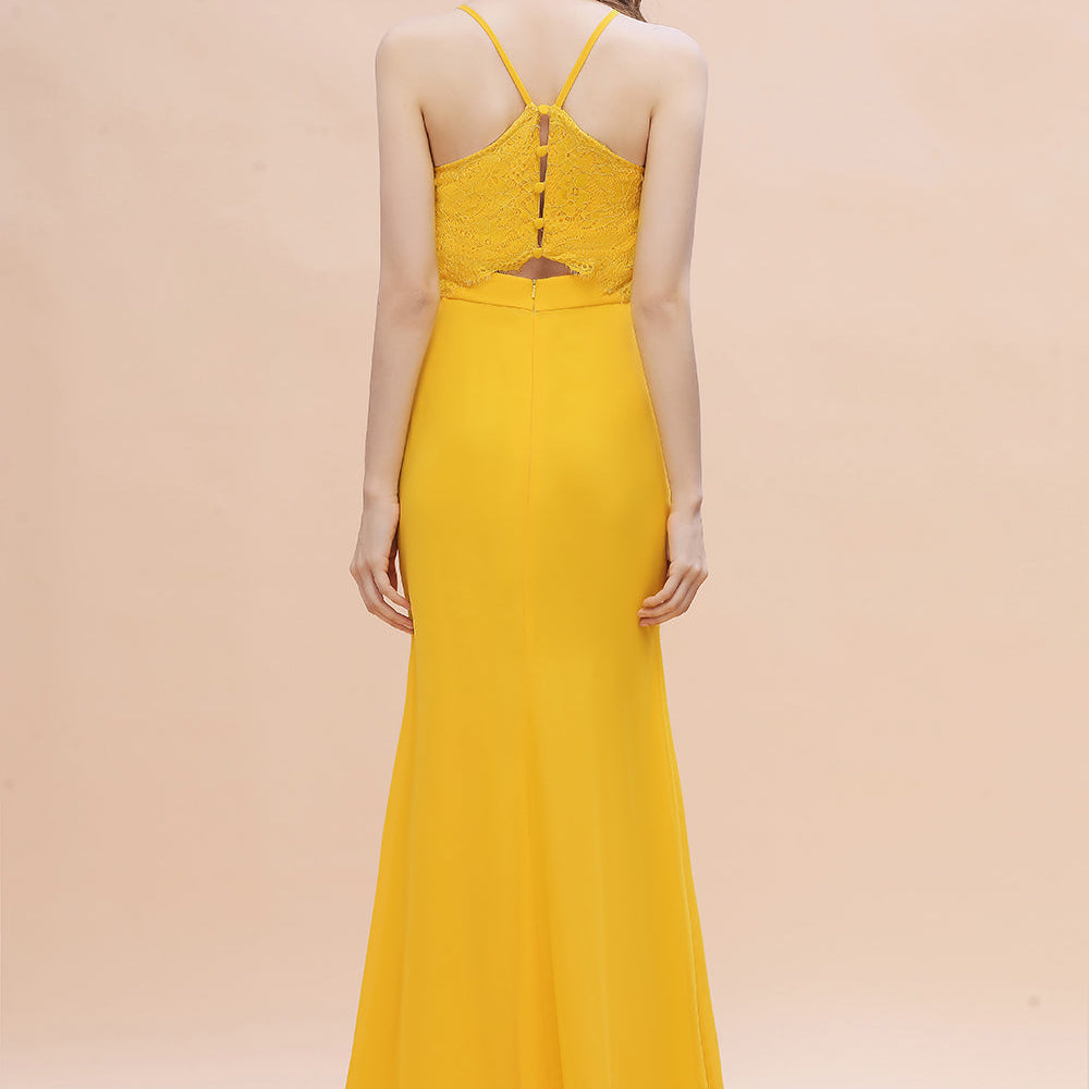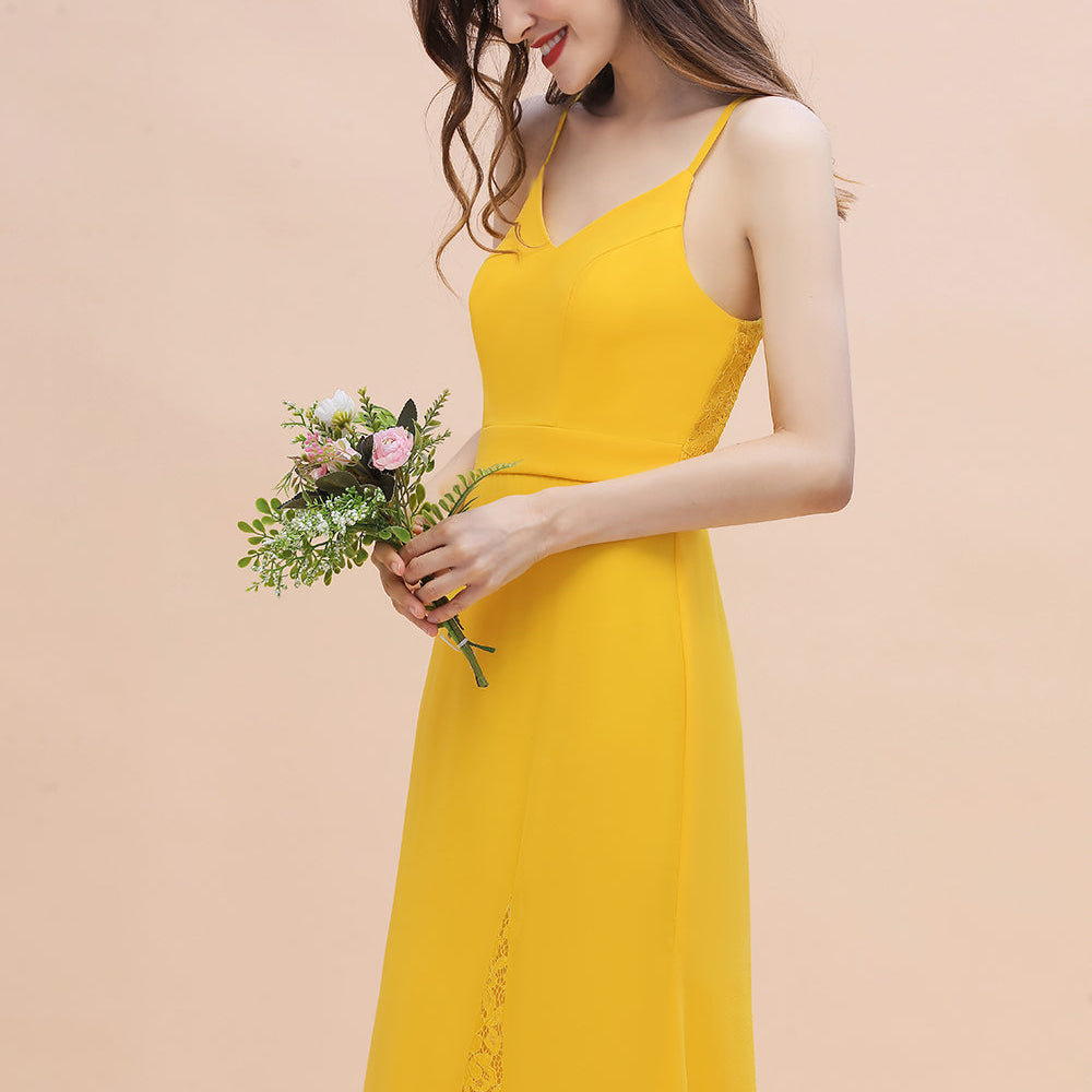 Chic Long V-neck Chiffon Backless Yellow Bridesmaid Dress