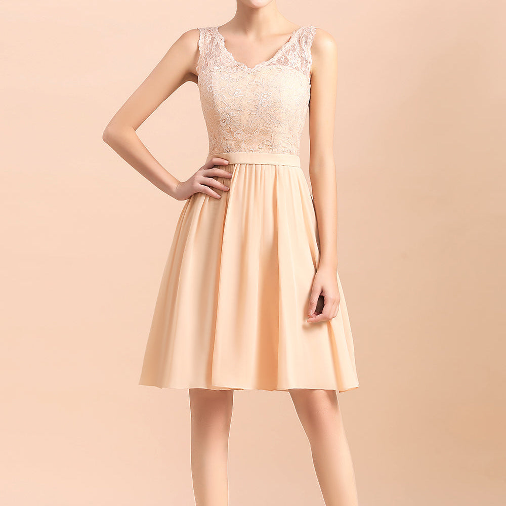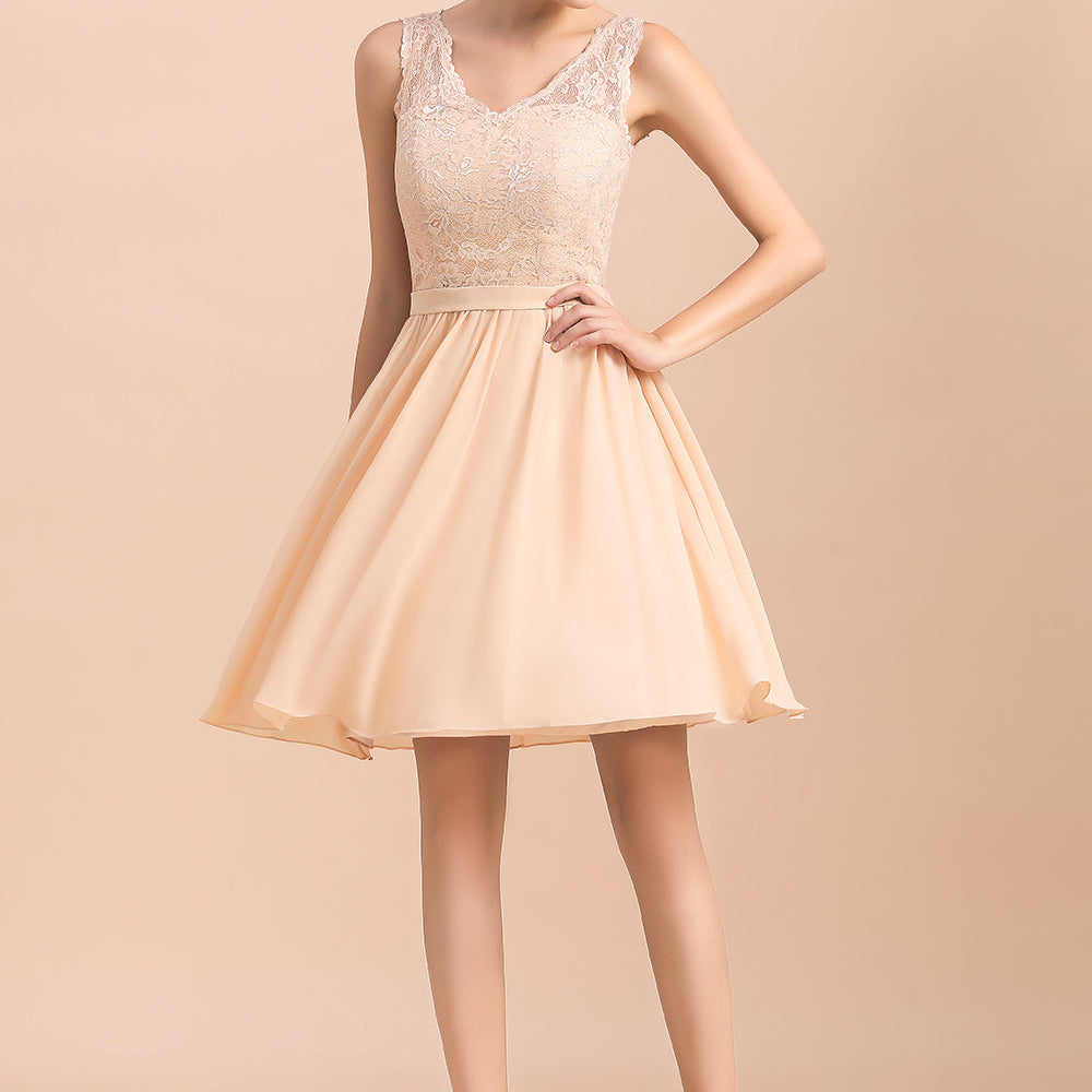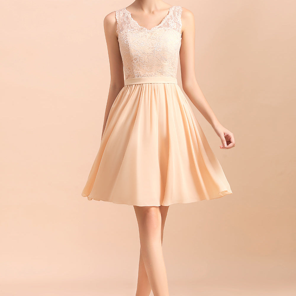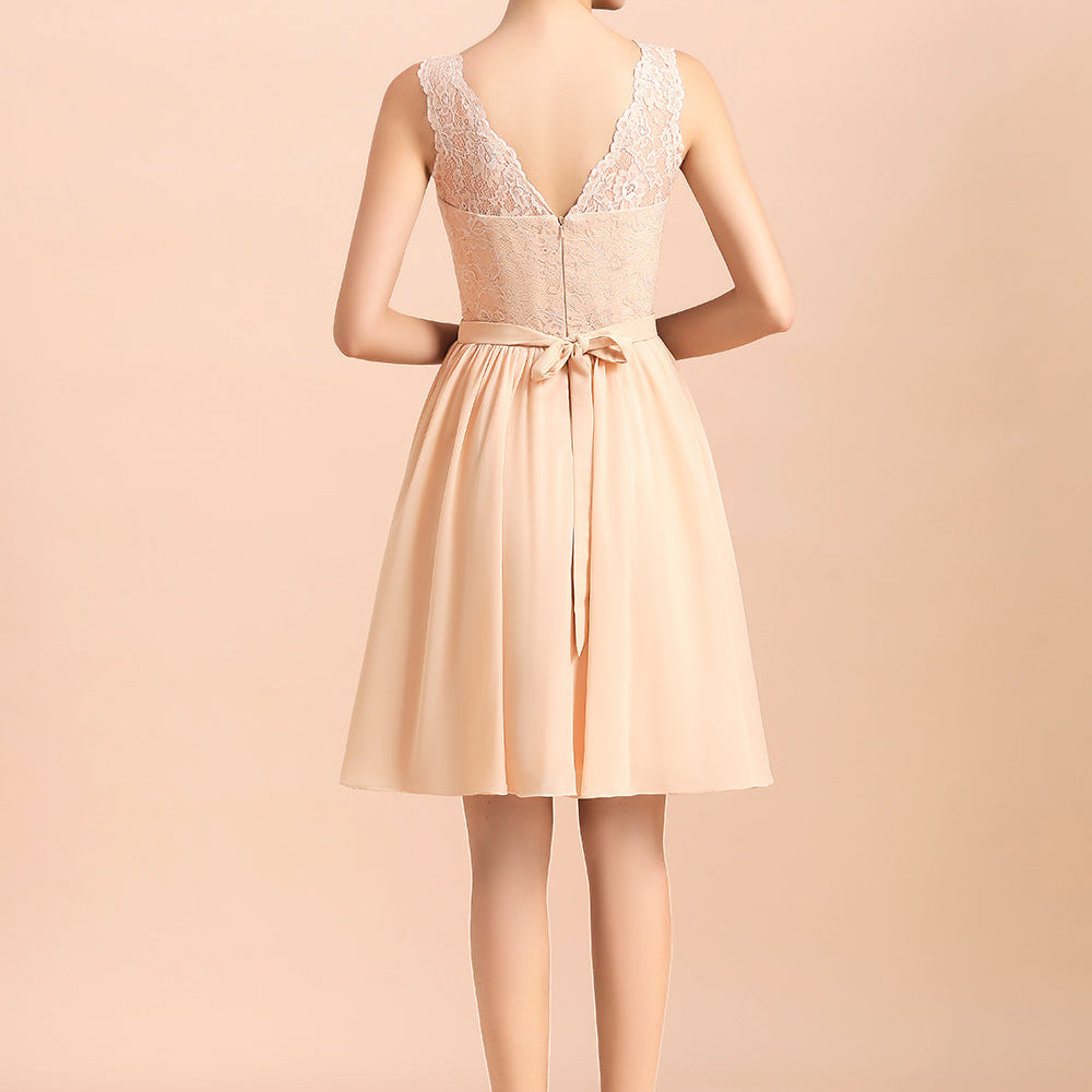 Cute A-Line V-neck Chiffon Backless Short Bridesmaid Dress with Lace