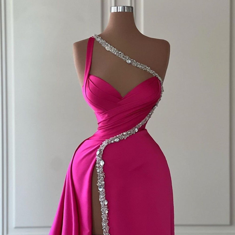 This elegant fuchsia prom dress is perfect for making an eye-catching entrance. Crafted from lightweight satin fabric with a sweetheart neckline, it features long sleeves with a one-shoulder design, and a slit at the front for added flair. Make a statement with this timeless piece.