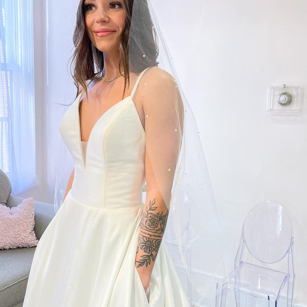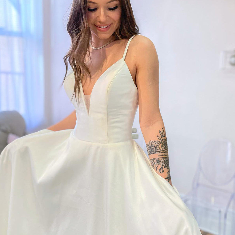 Glamorous Long A-Line Sweetheart Satin Backless Wedding Dress With Pockets