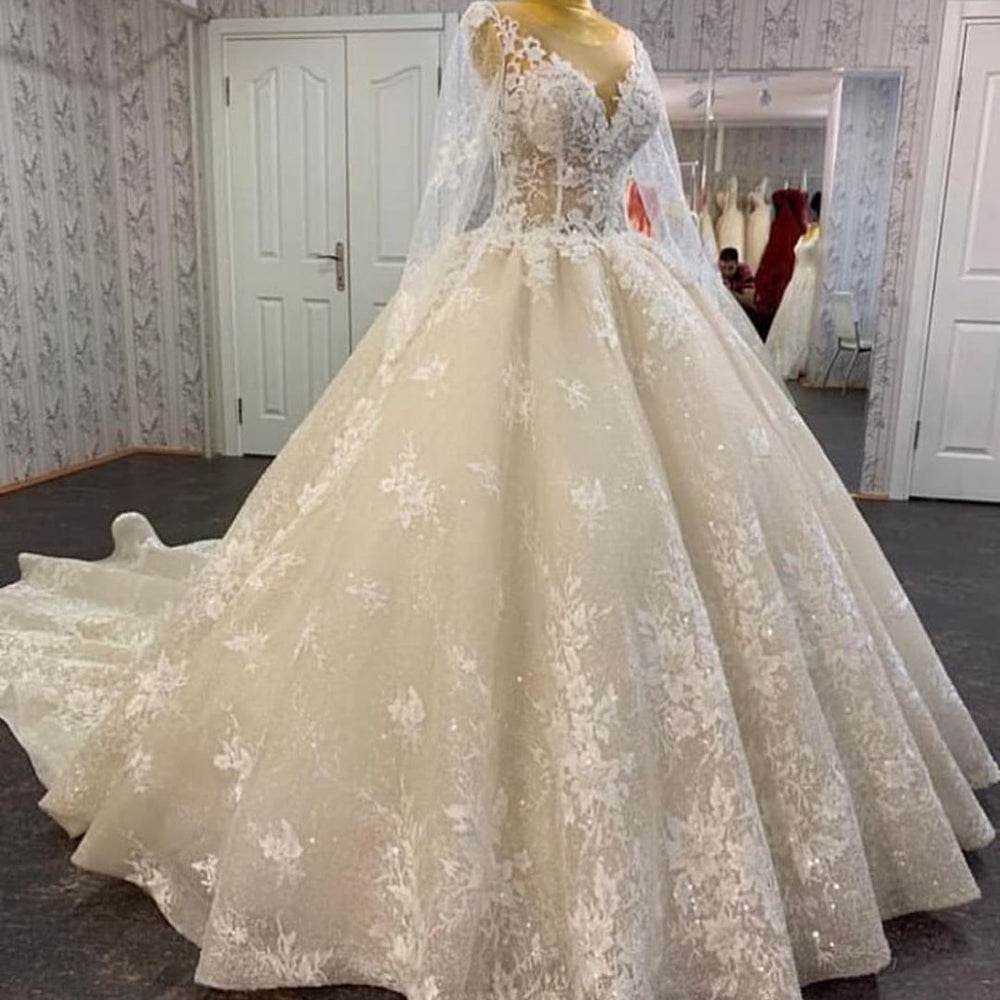 Long A-line Bateau Appliques Lace Sequins Tulle Wedding Dress