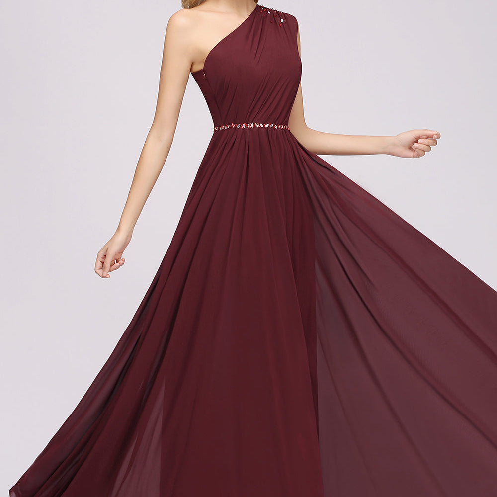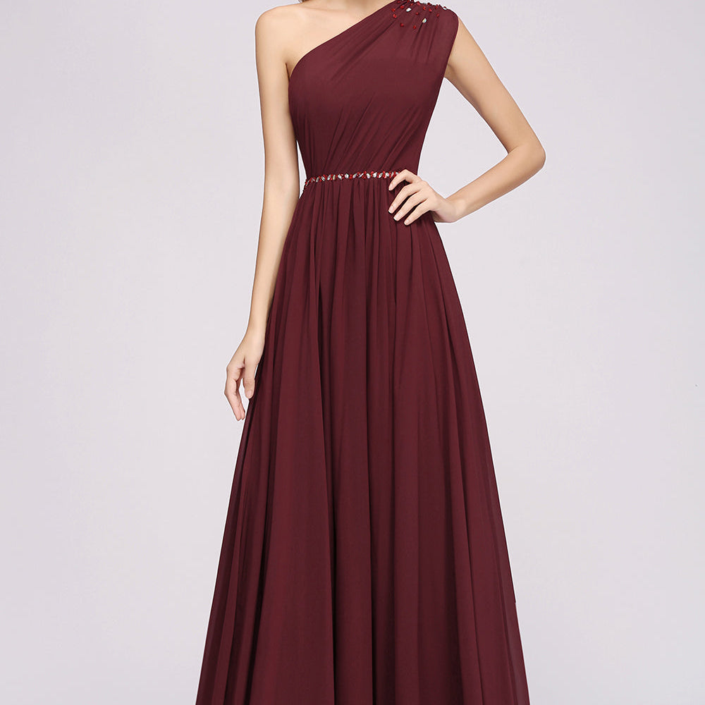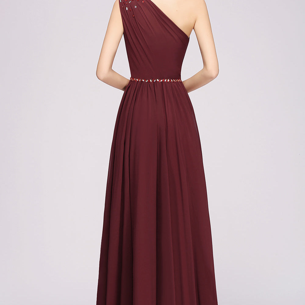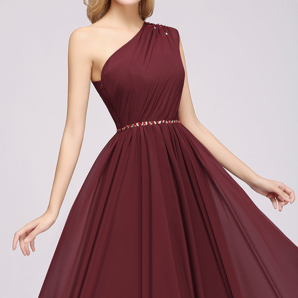 Long A-Line Burgundy Chiffon One Shoulder Bridesmaid Dresses with Beadings