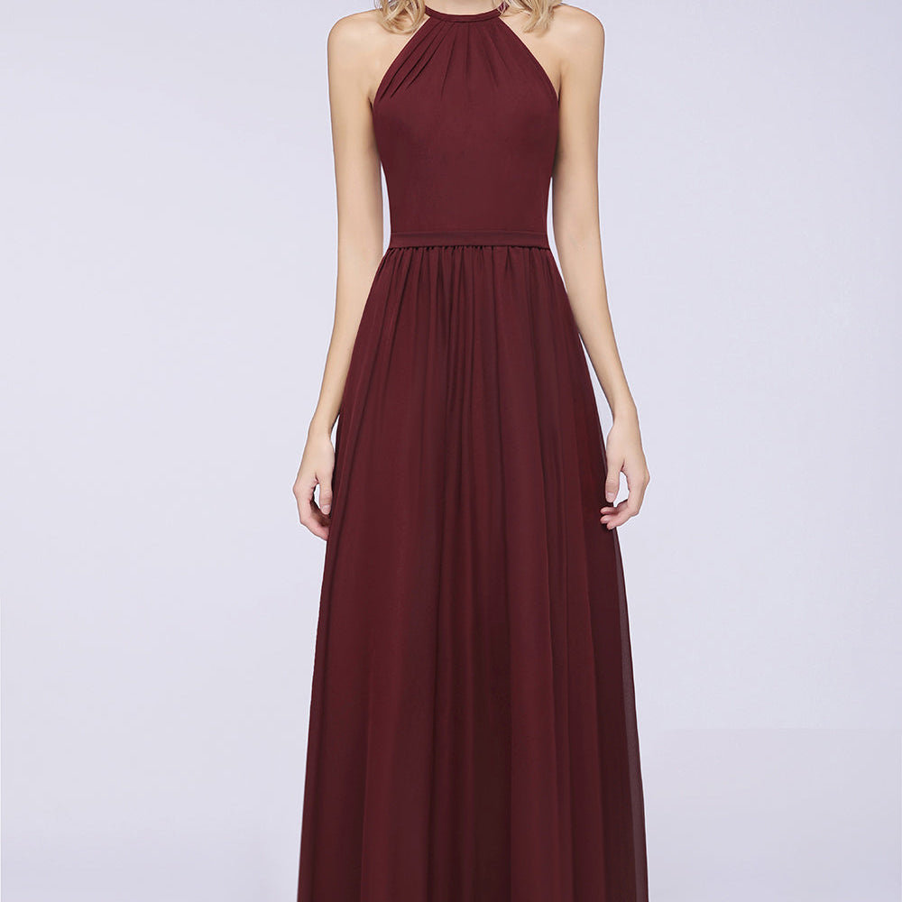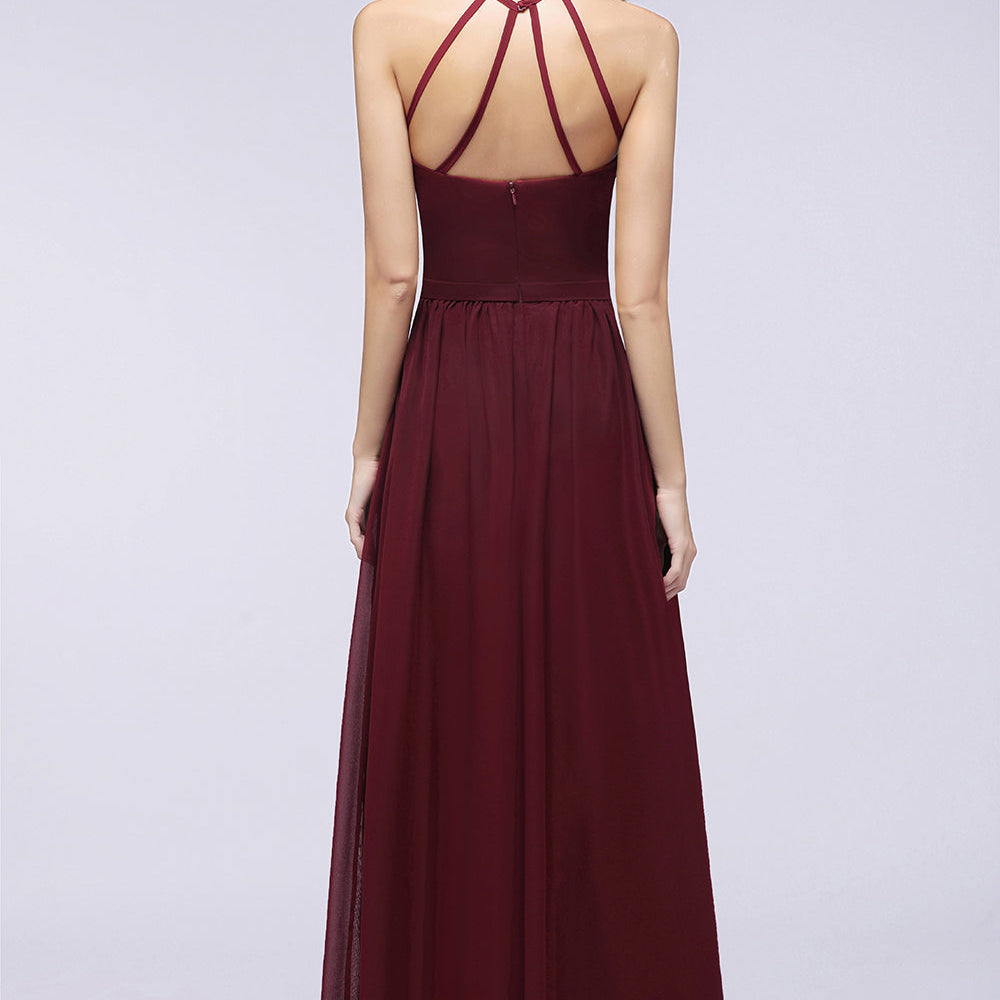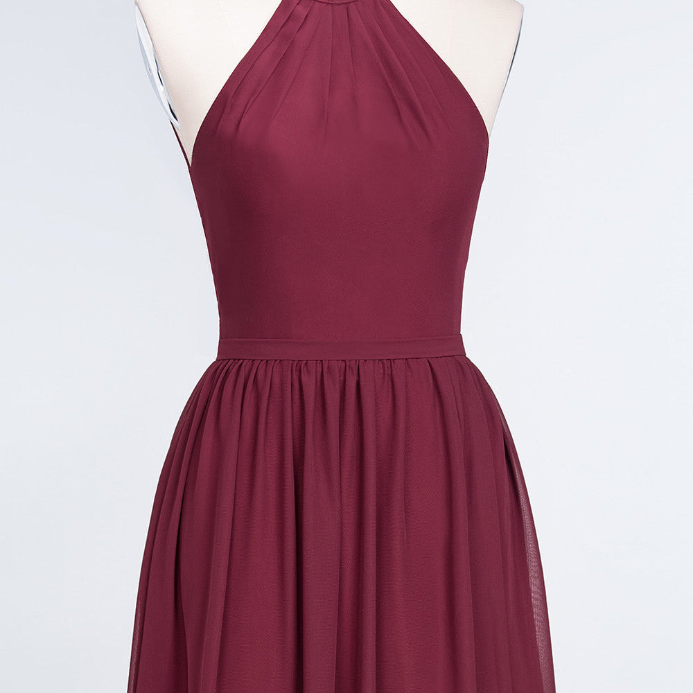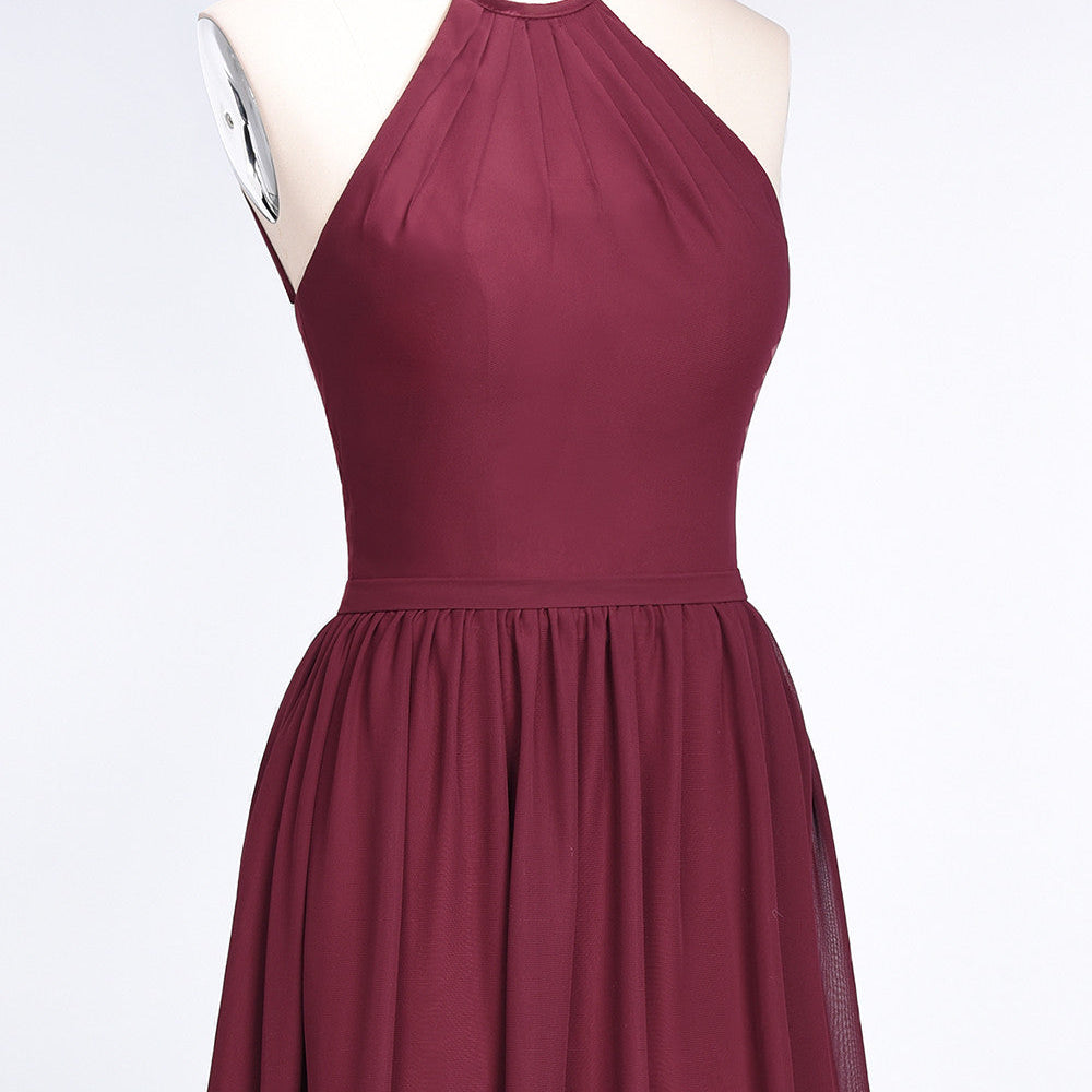 Long A-Line Chiffon Halter Sleeveless Burgundy Bridesmaid Dress with Ruffles