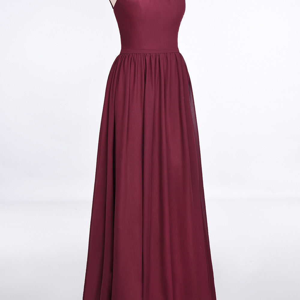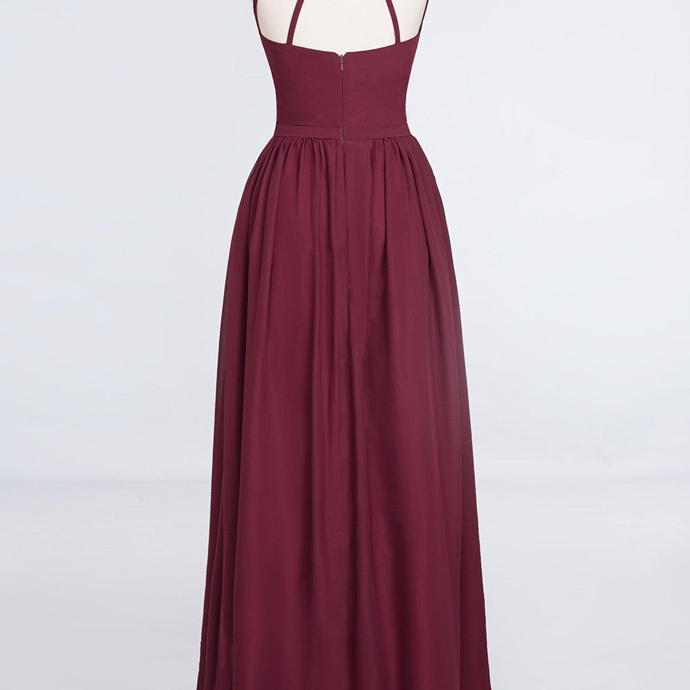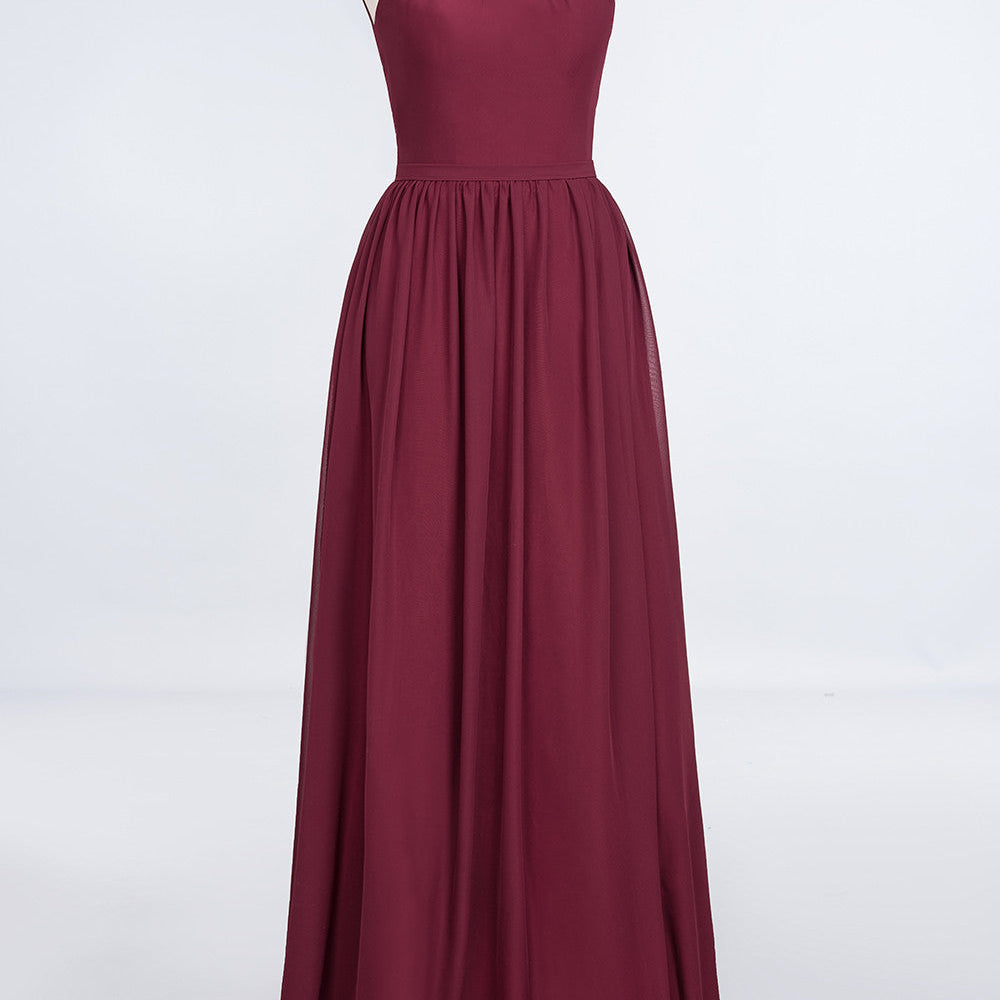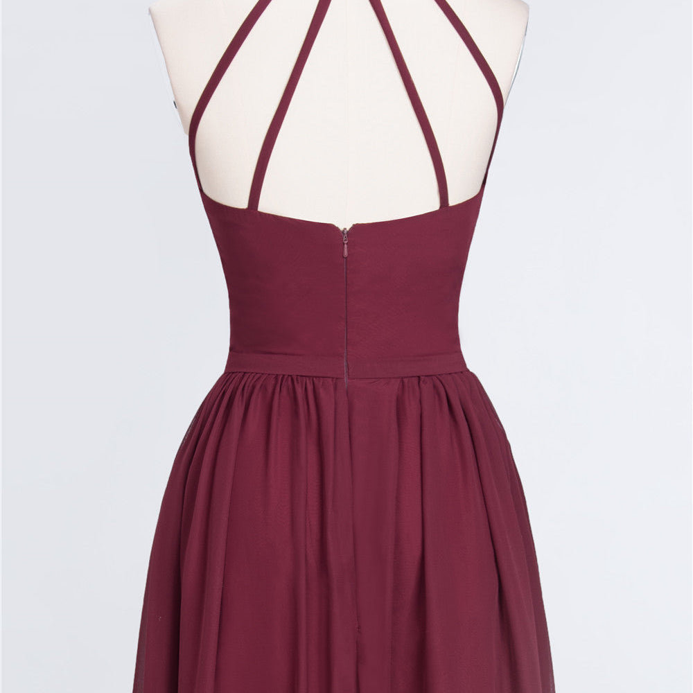 Long A-Line Chiffon Halter Sleeveless Burgundy Bridesmaid Dress with Ruffles