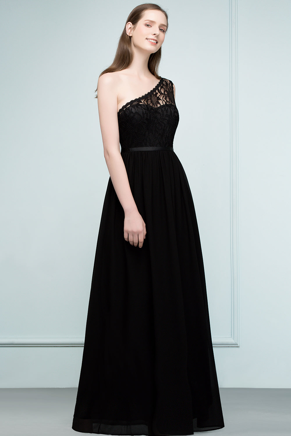 Long A-line Chiffon Lace One-shoulder Bridesmaid Dress with Sash