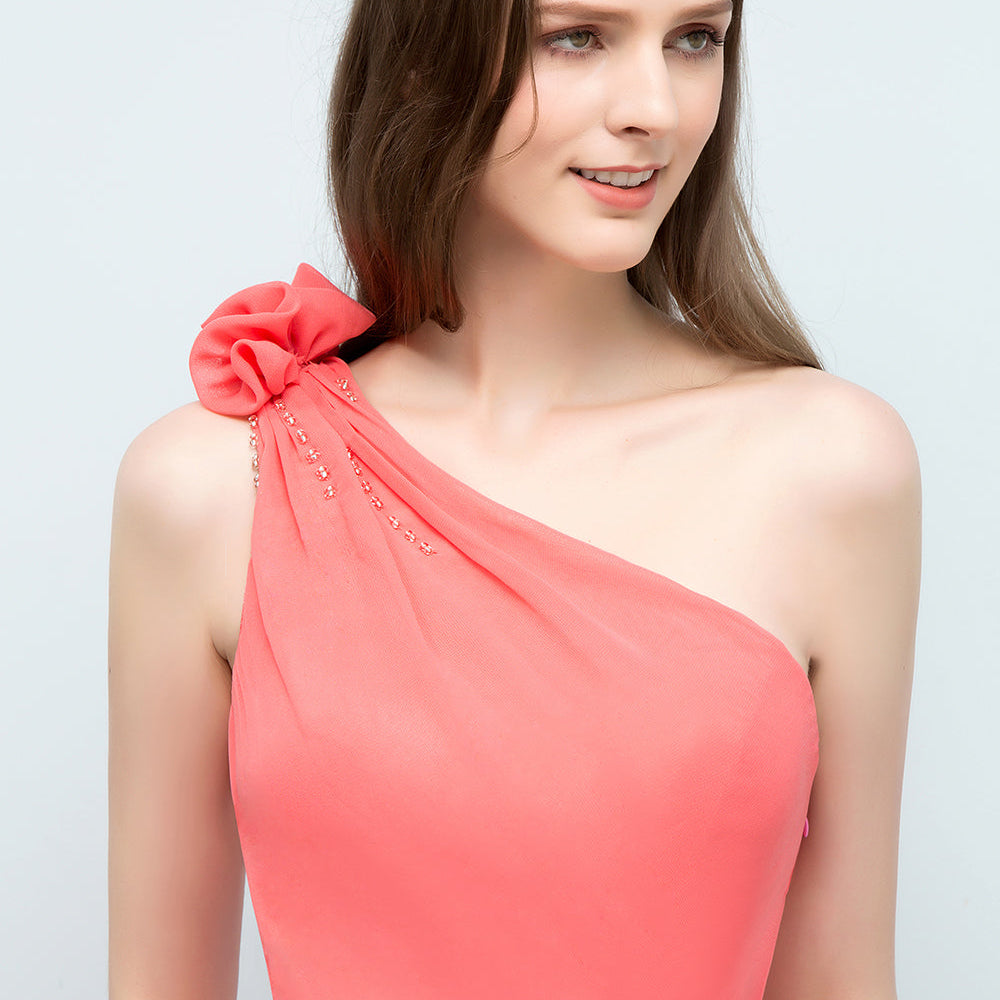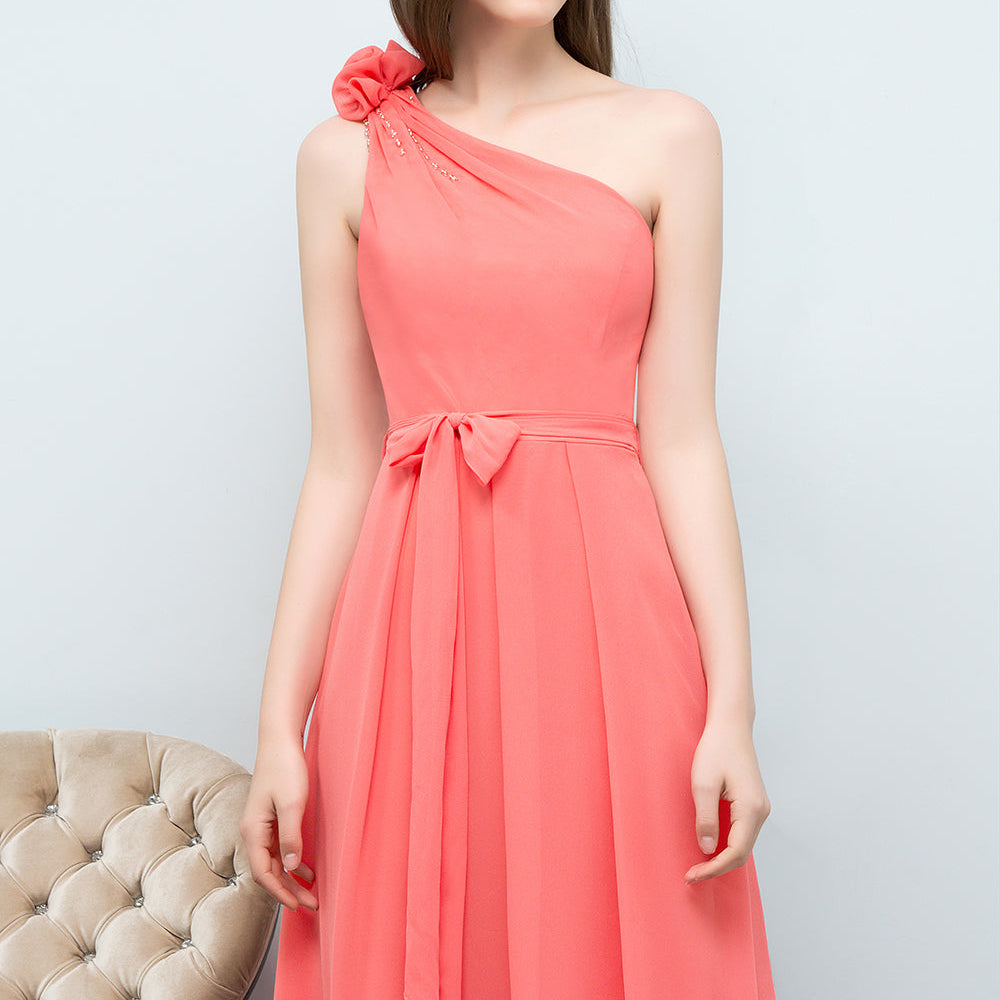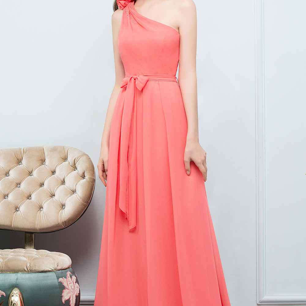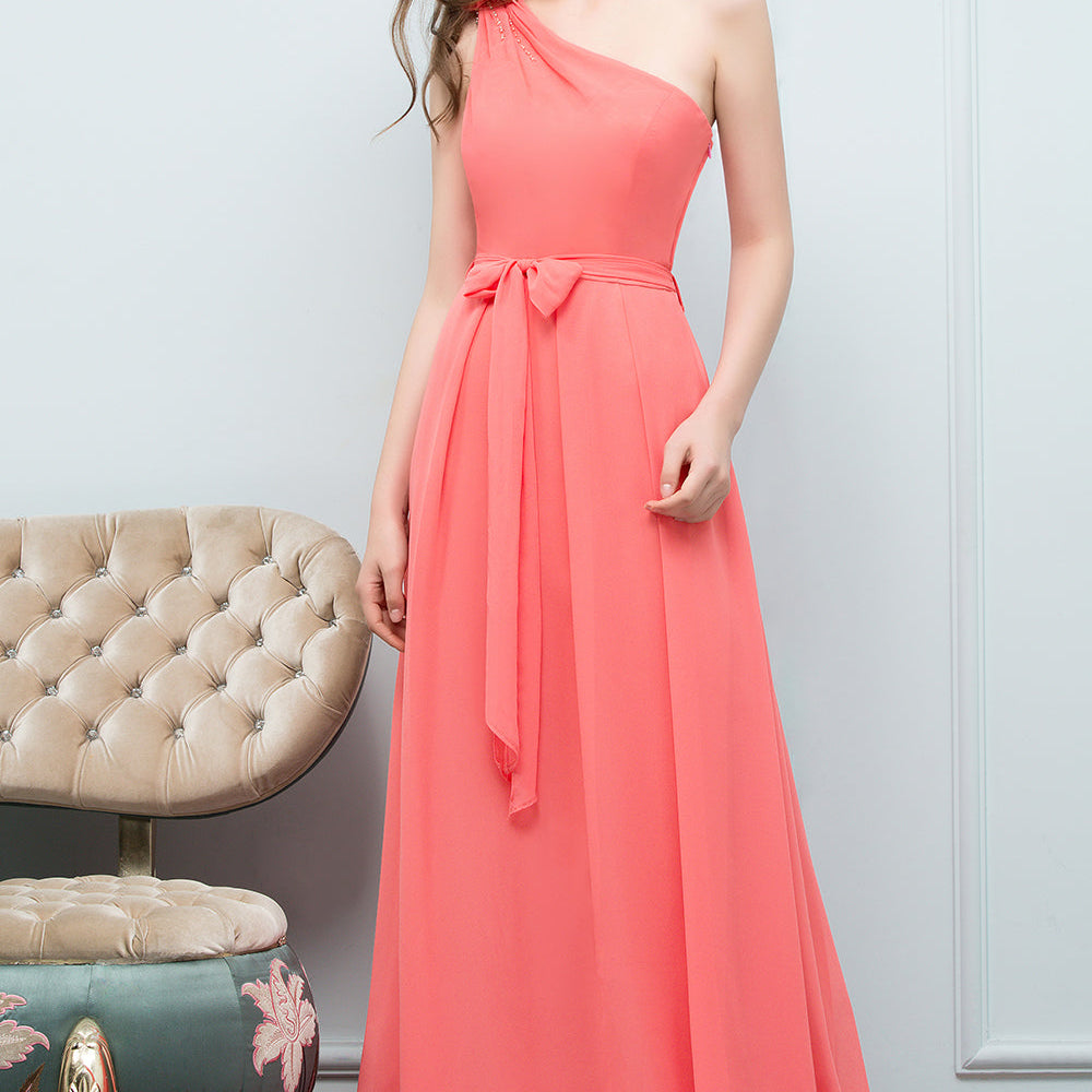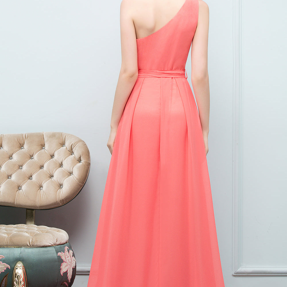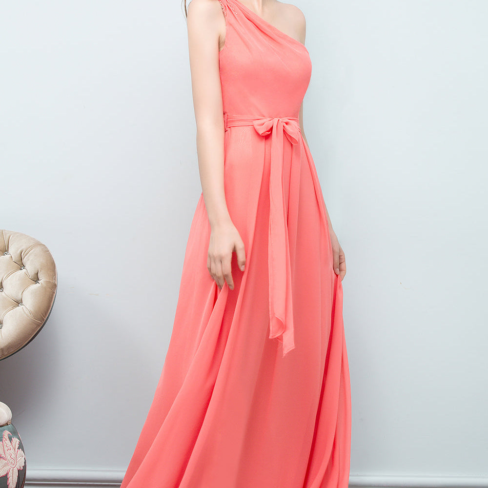 Long A-line Chiffon One-Shoulder Sleeveless Bridesmaid Dress with Bow Sash