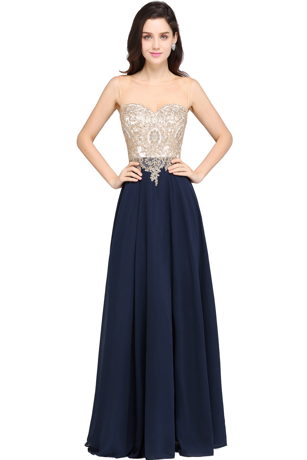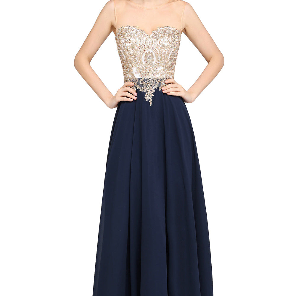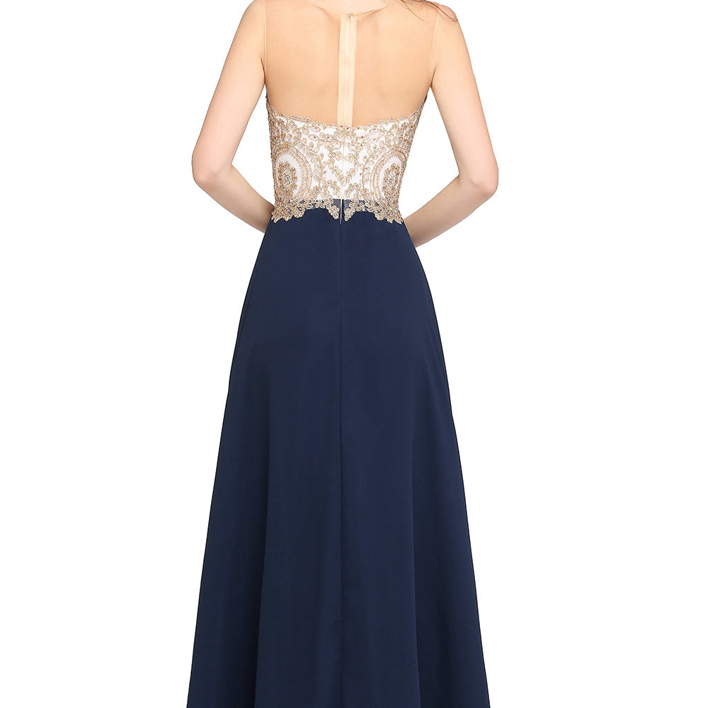 Long A-Line Chiffon Tulle Lace Scoop Sleeveless Bridesmaid Dress with Beadings