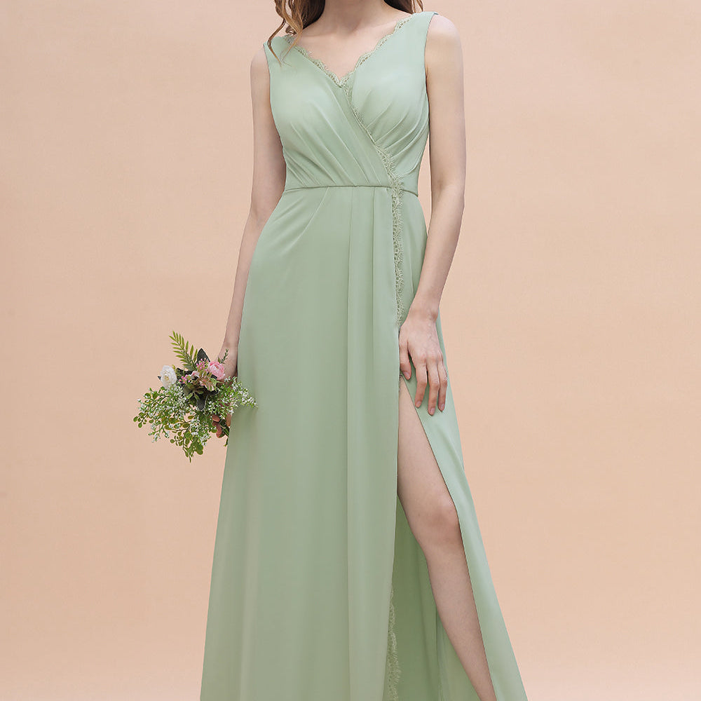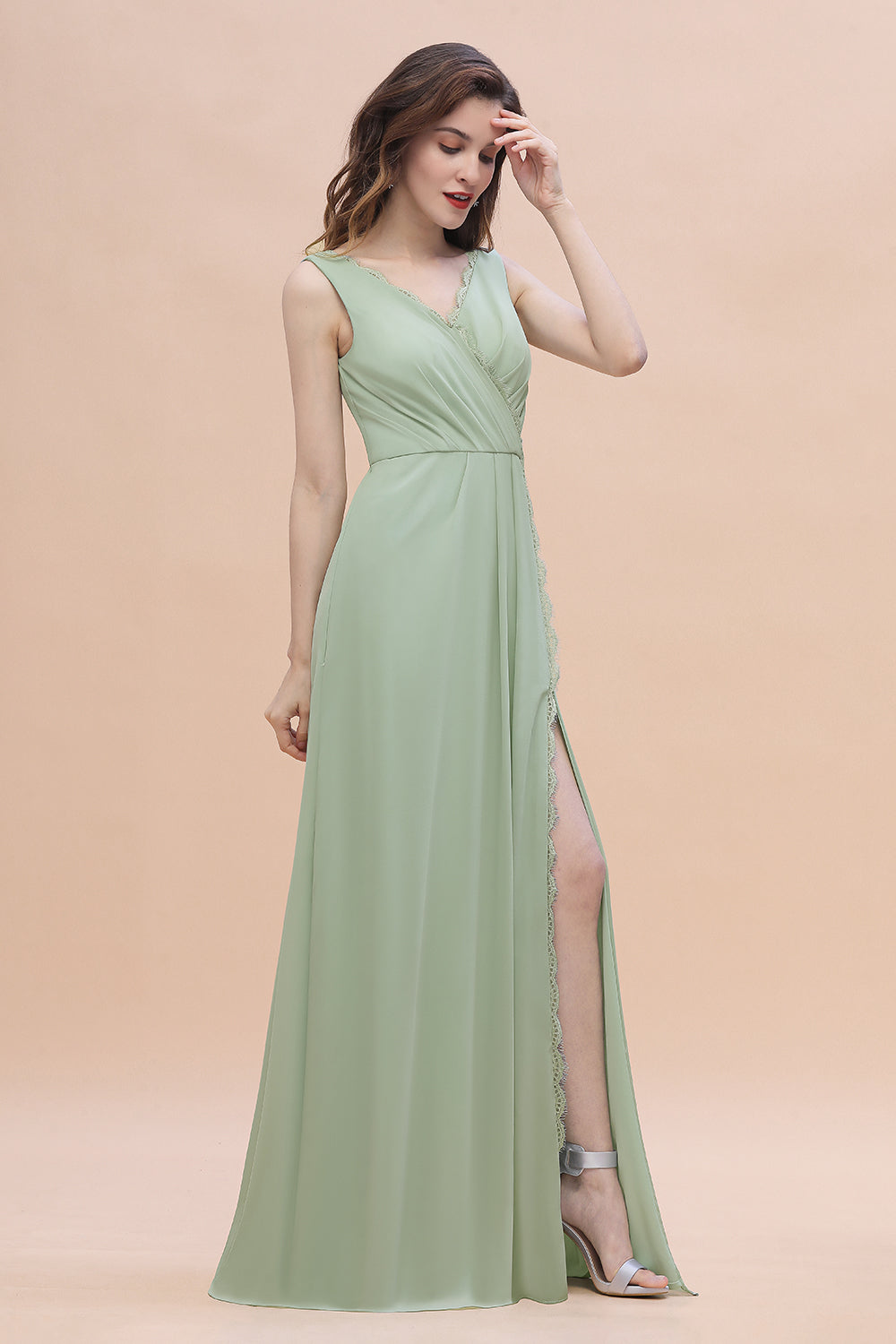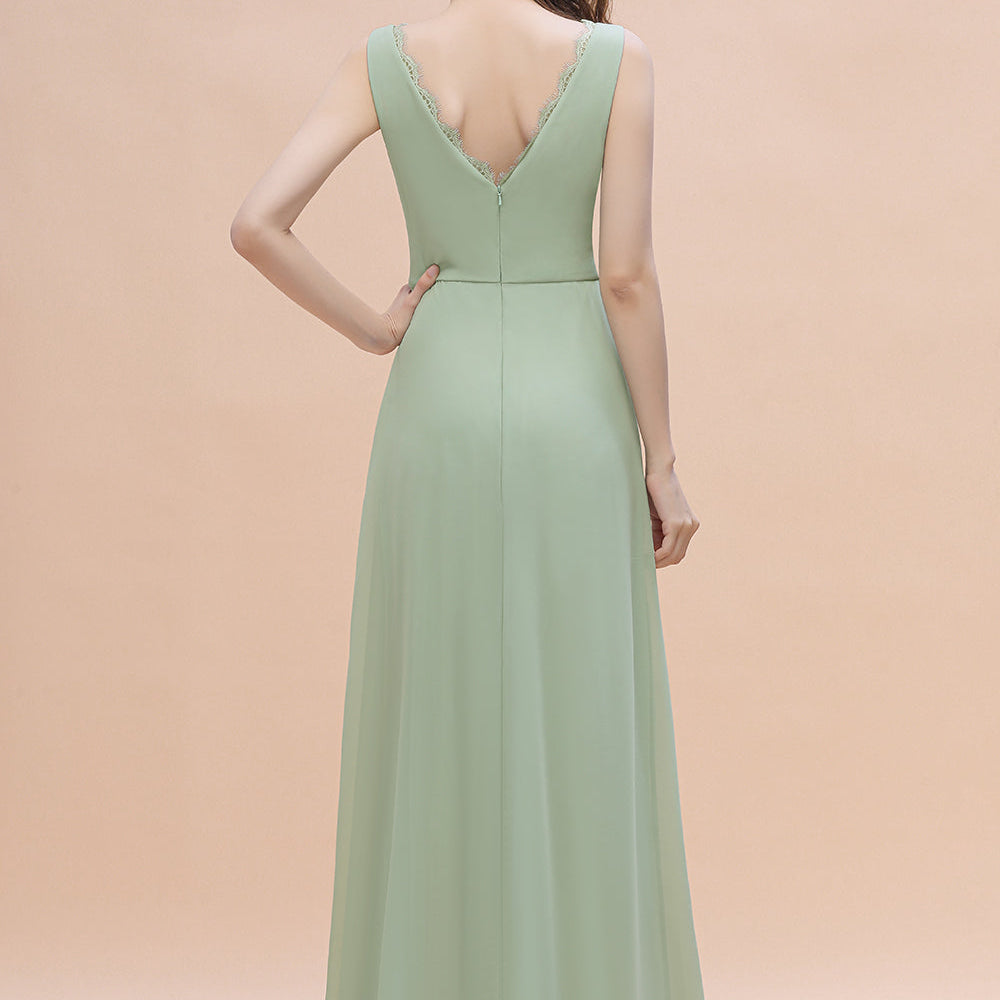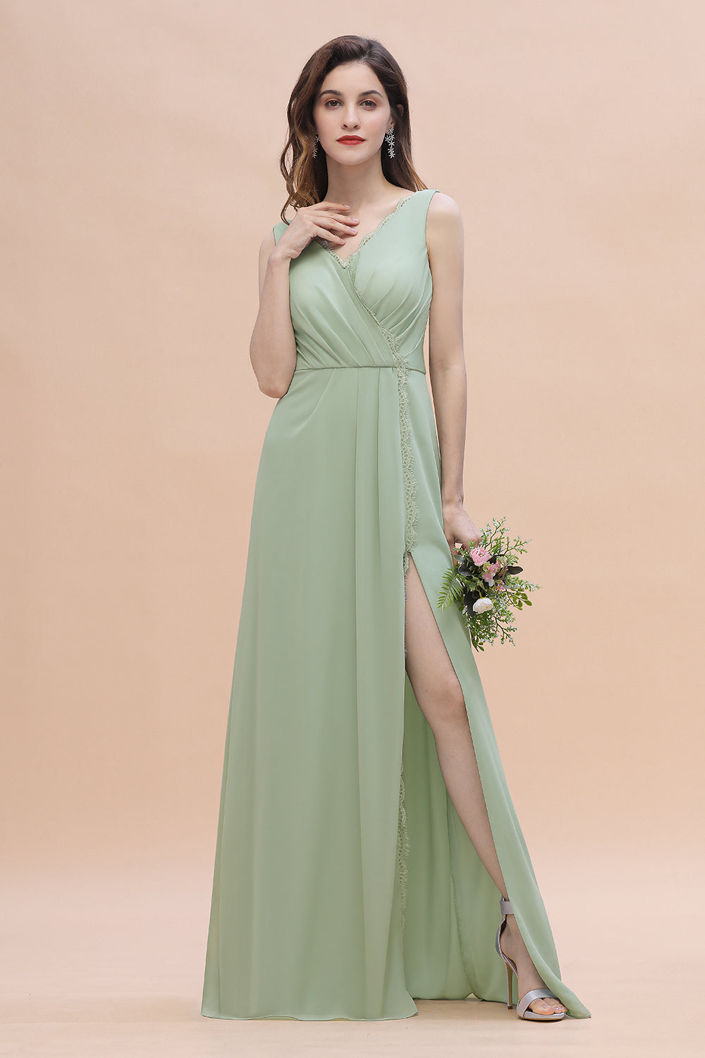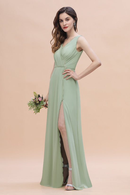 Long A-Line V-Neck Ruffles Chiffon Bridesmaid Dress With Slit