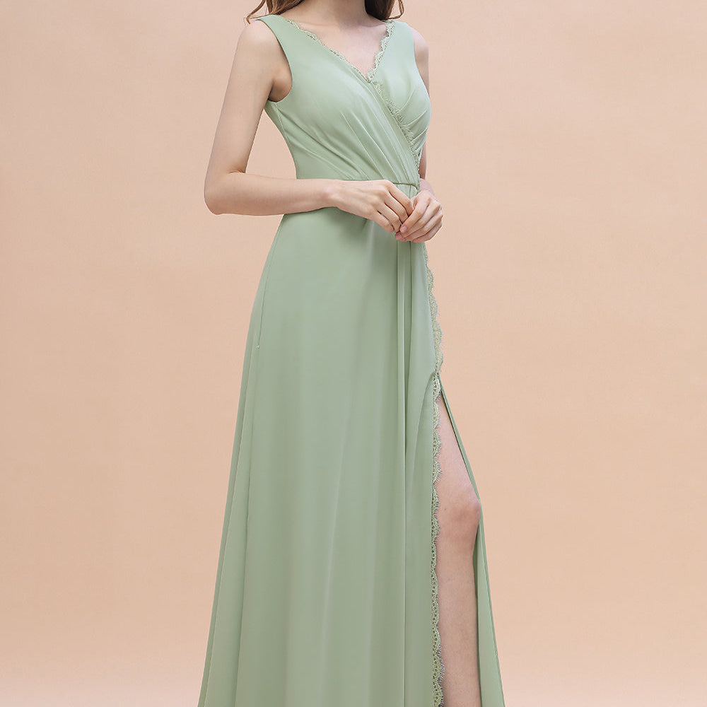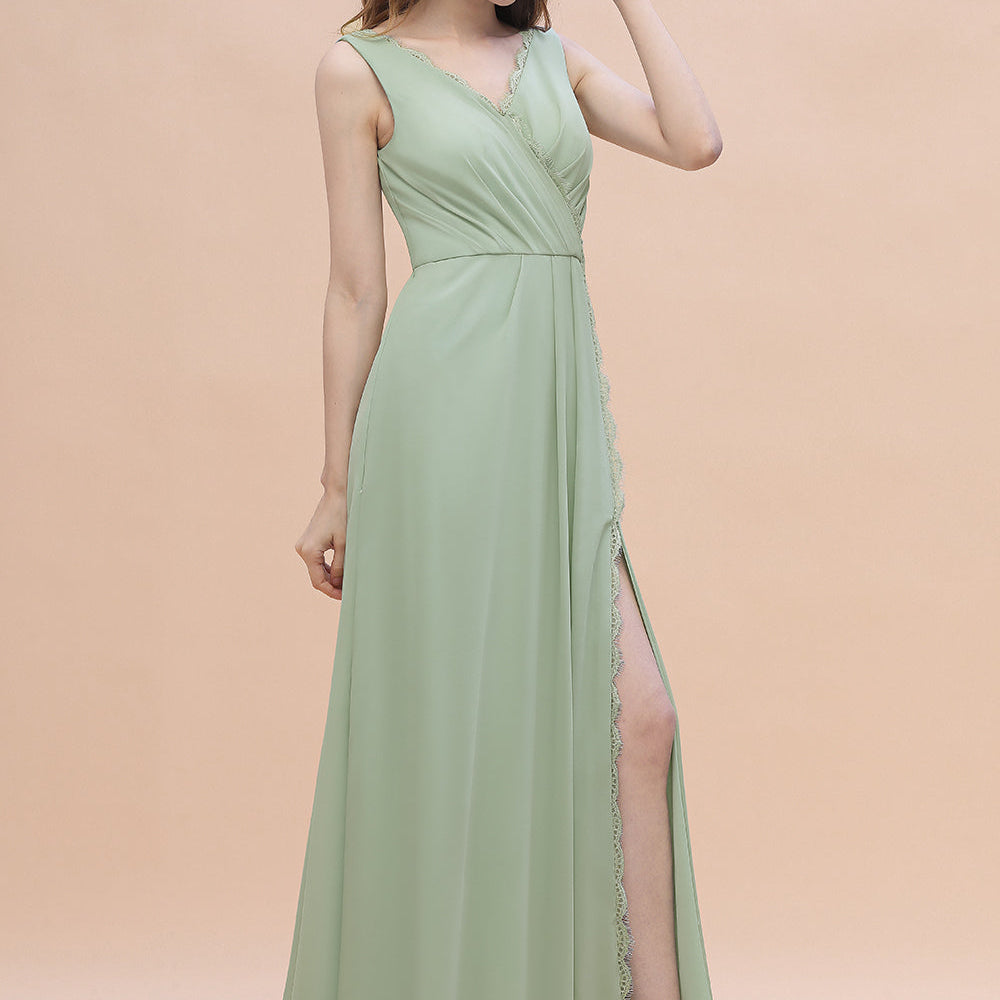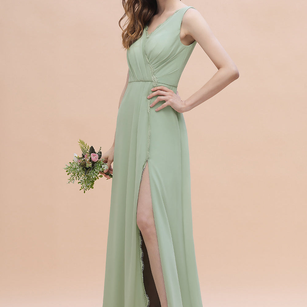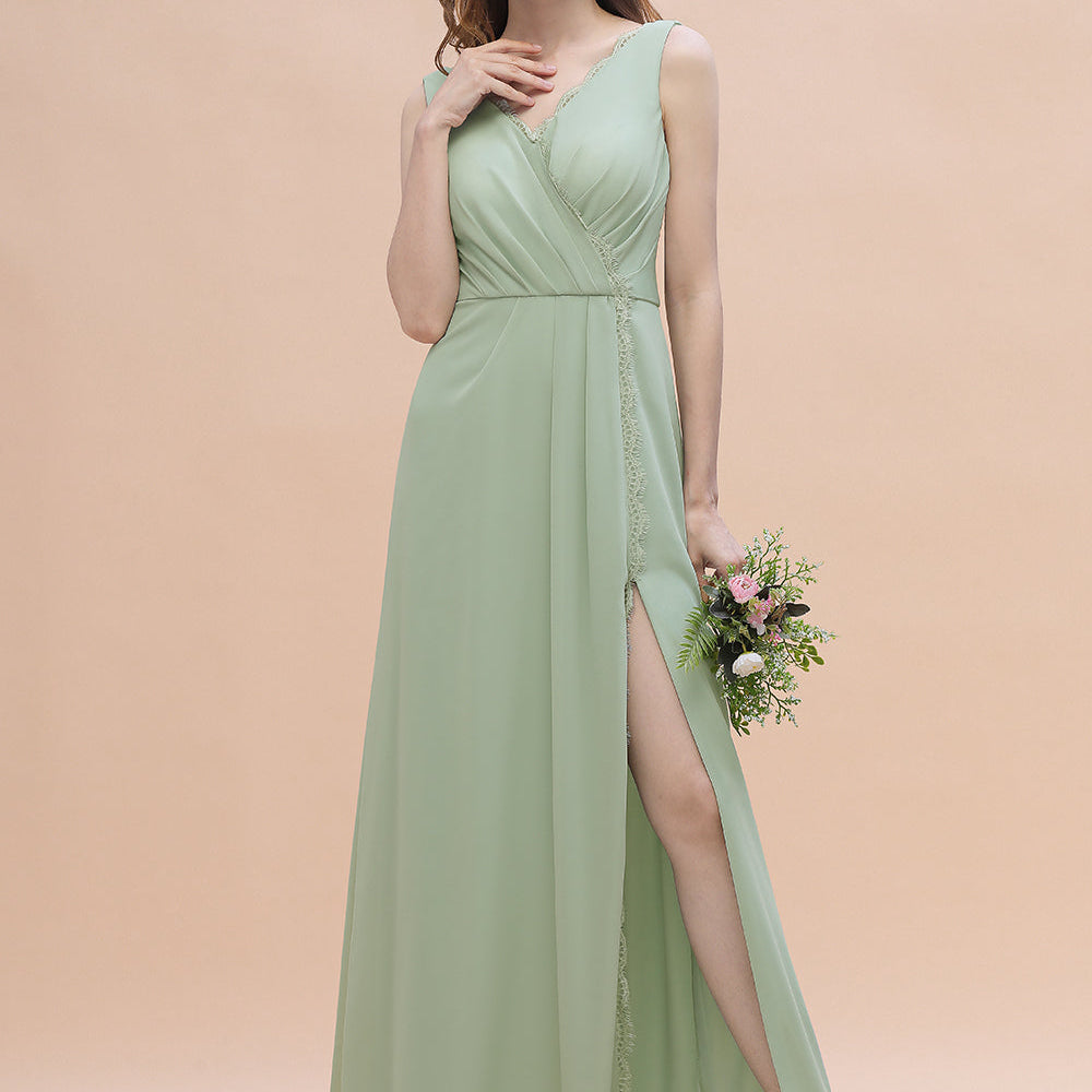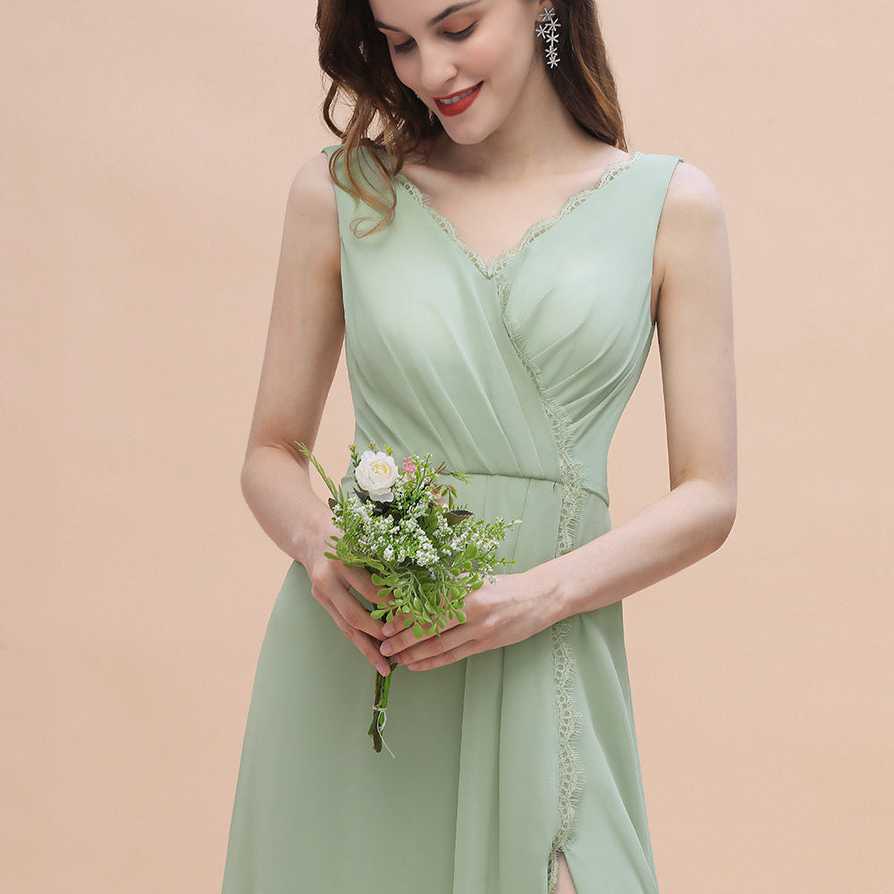Long A-Line V-Neck Ruffles Chiffon Bridesmaid Dress With Slit