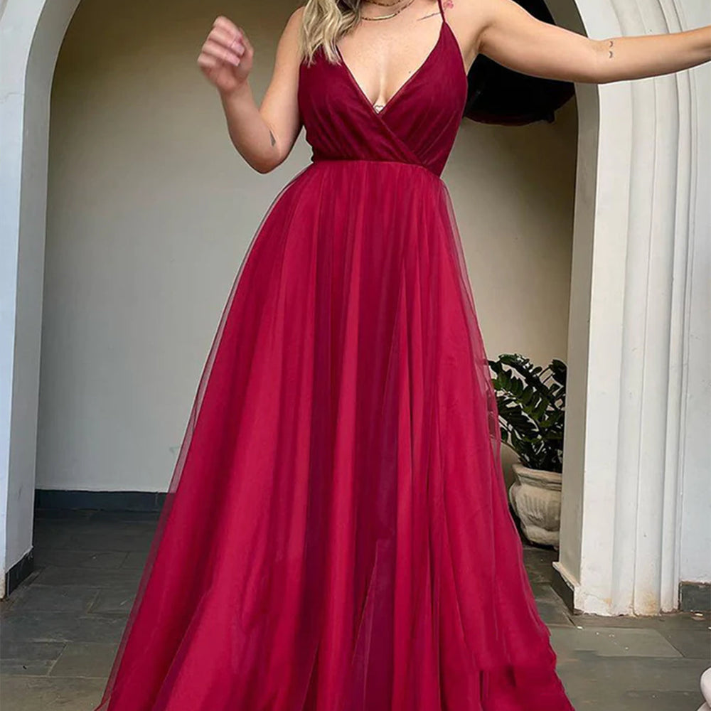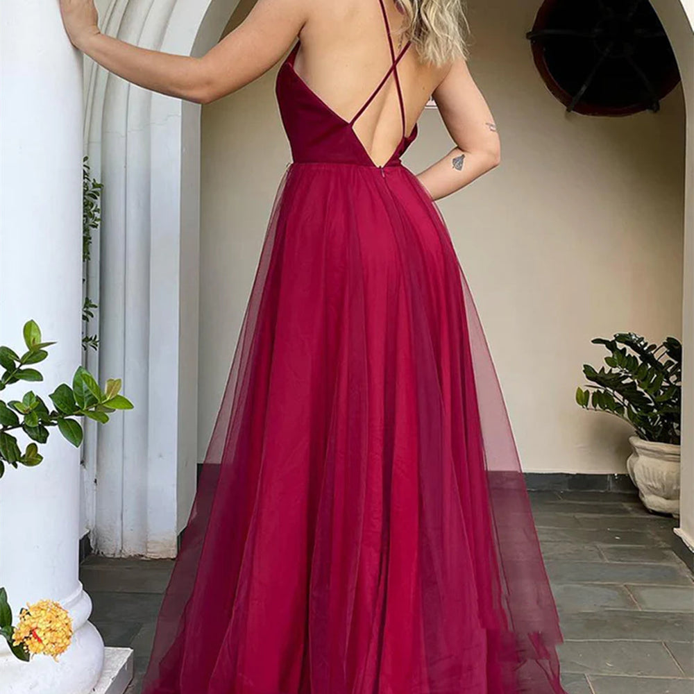 Long A-line V-neck Tulle Backless Prom Dress Burgundy Formal Evening Dresses