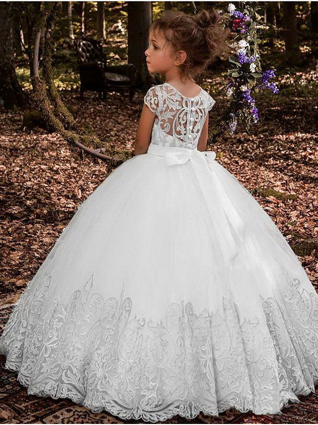 Long Ball Gown Lace Tulle Jewel Neck Wedding Party Flower Girl Dresses