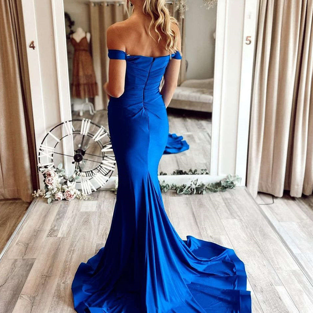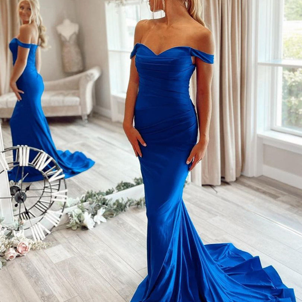 Long Mermaid off the shoulder Satin Prom Dress Royal Blue Formal Evening Dresses