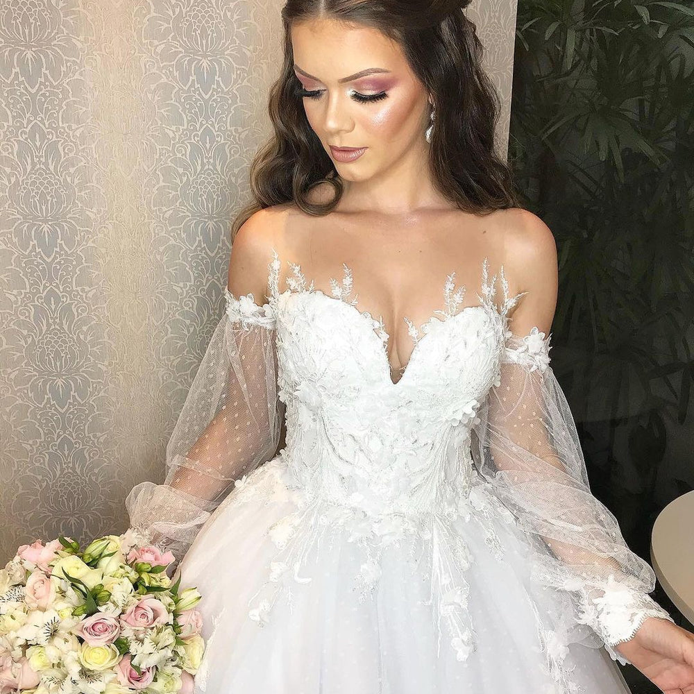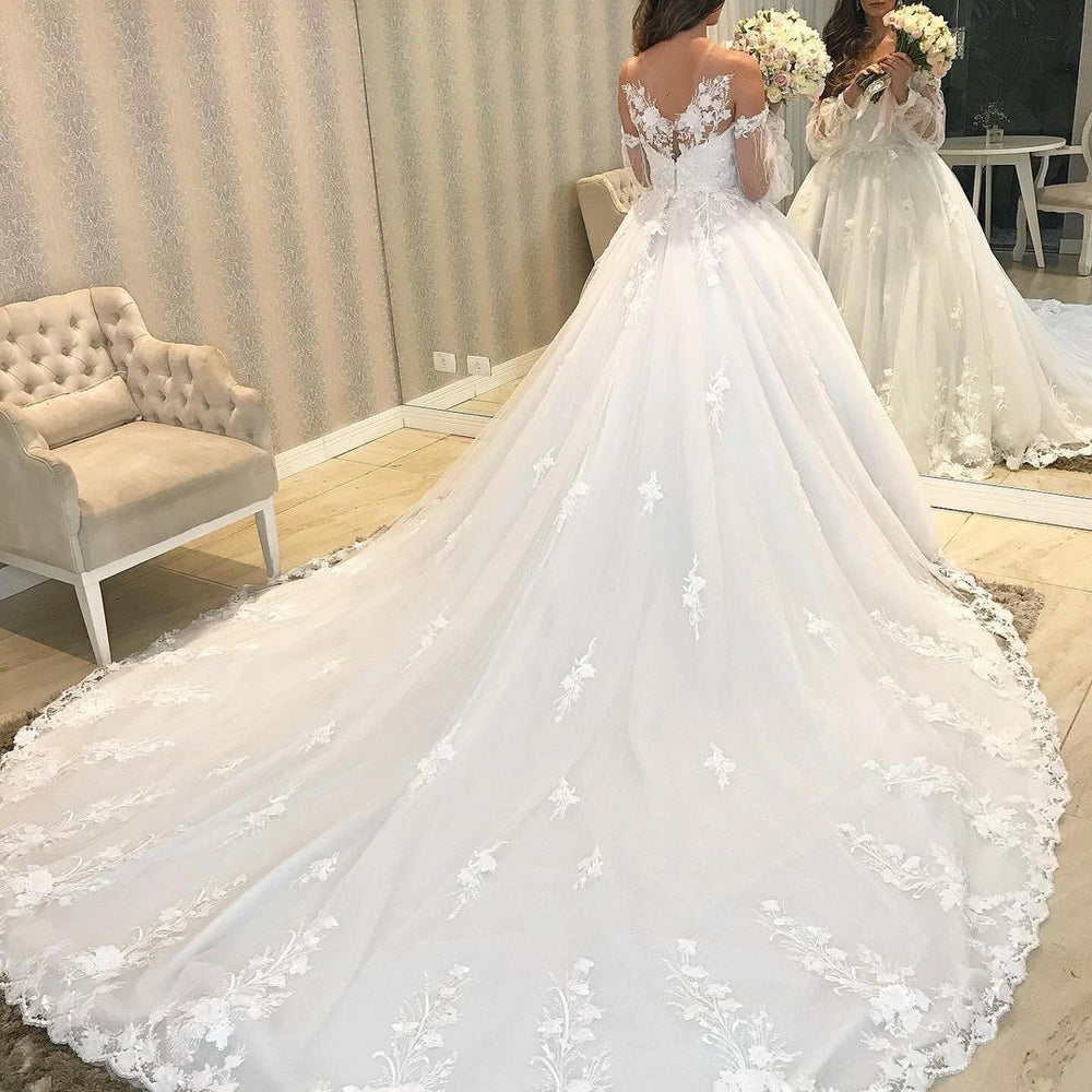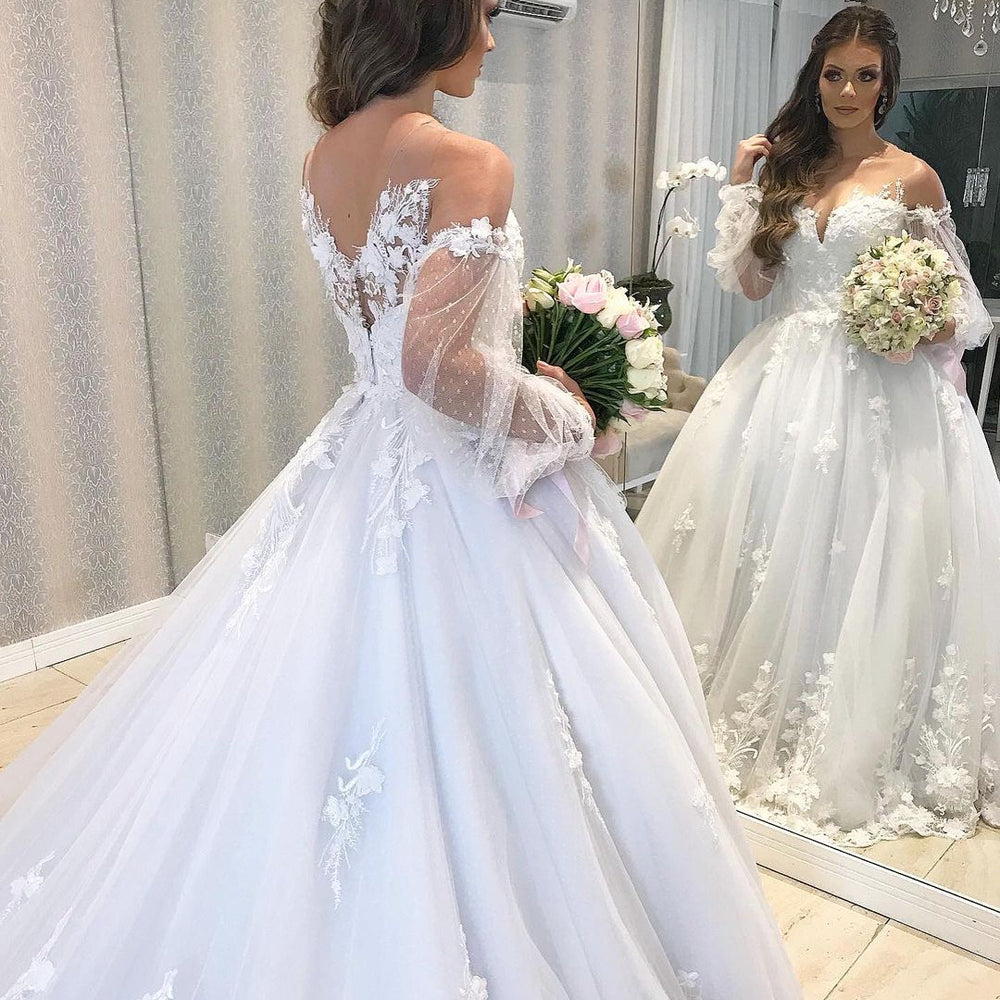 Long Princess Off-the-shoulder Tulle Wedding Dress with Bubble Sleeves