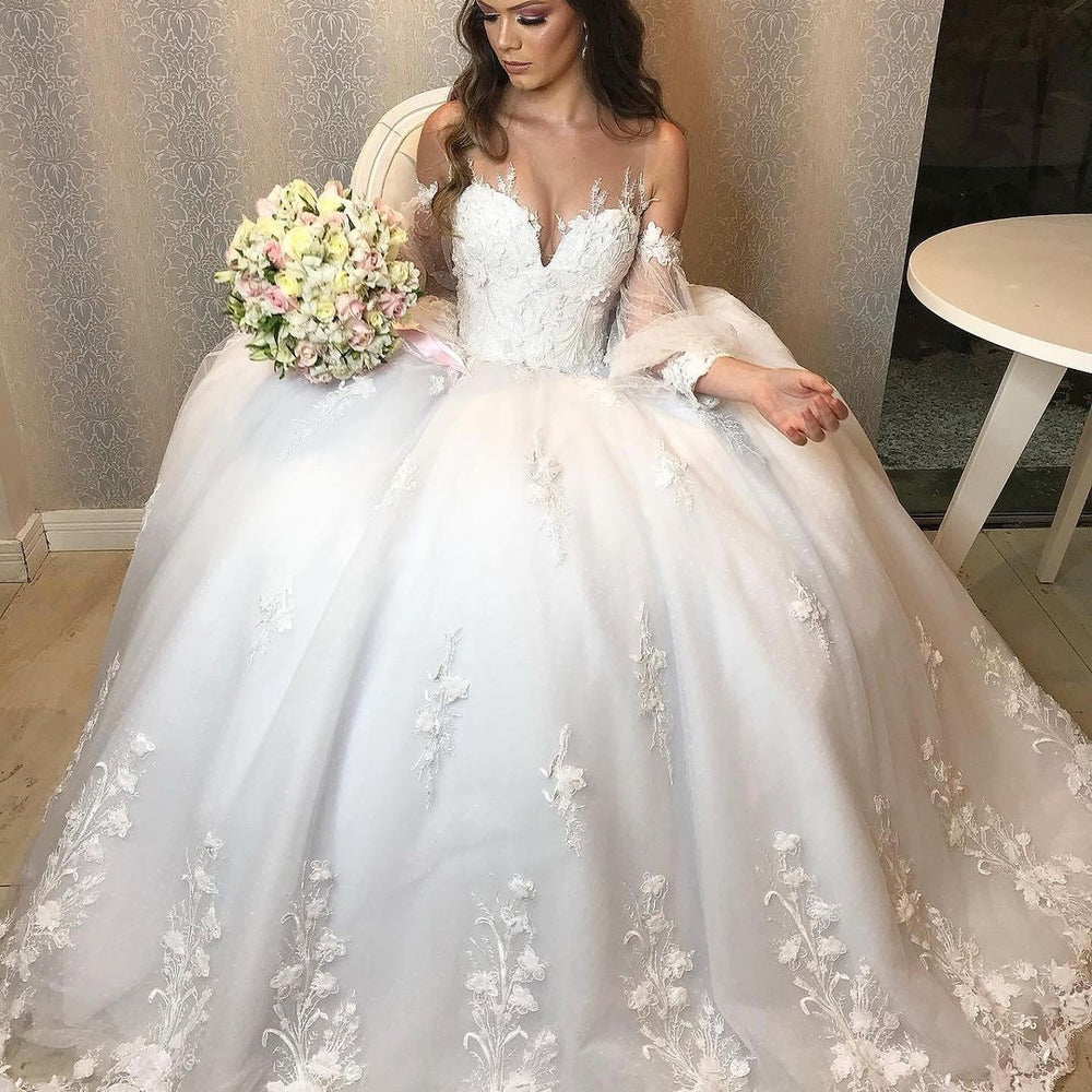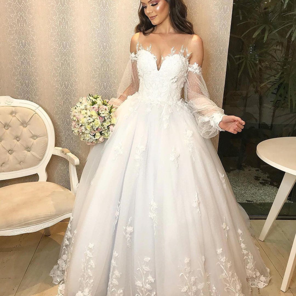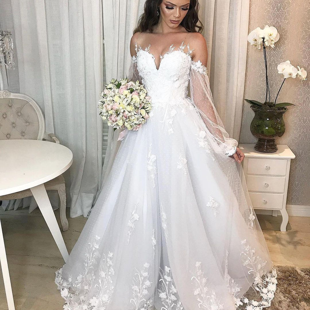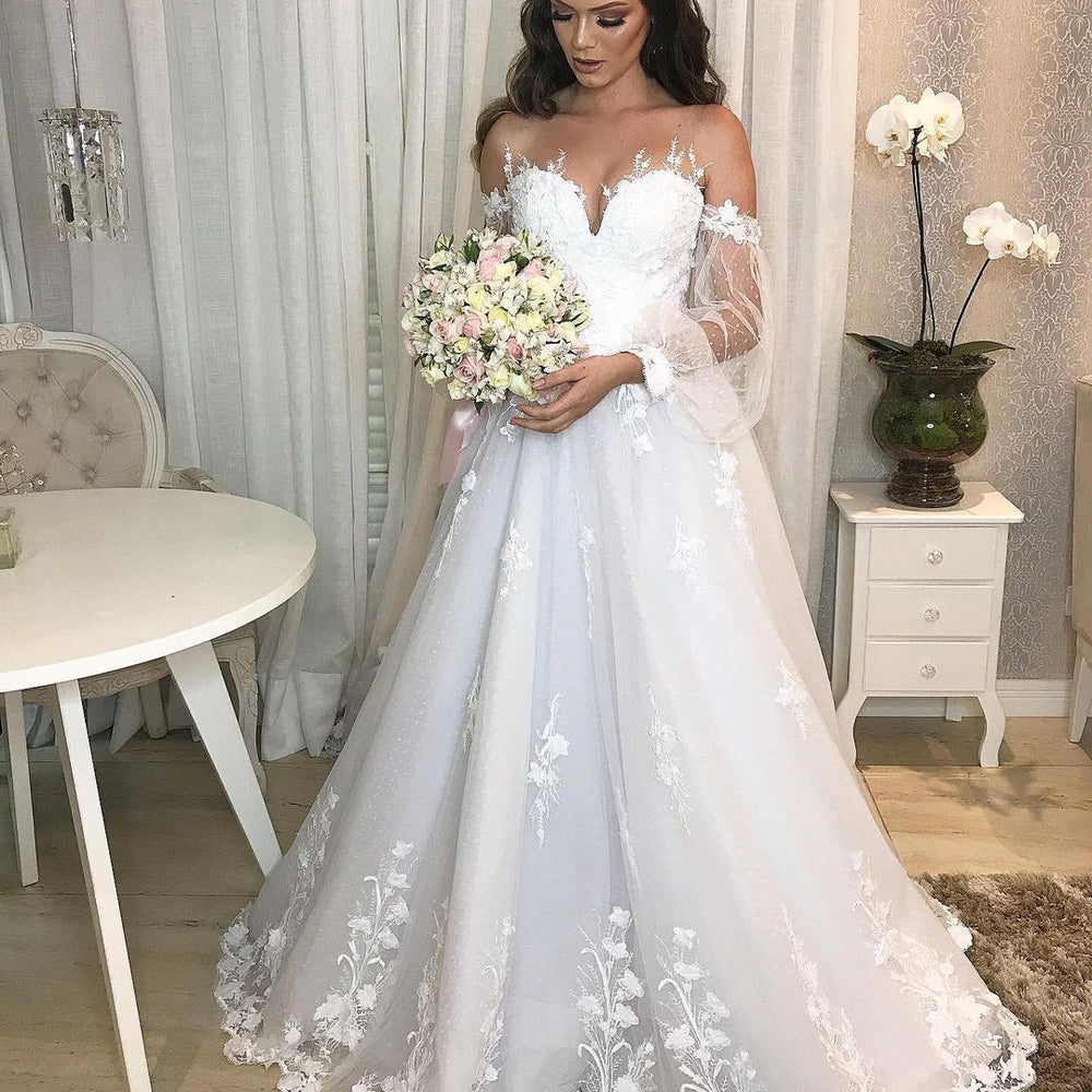 Long Princess Off-the-shoulder Tulle Wedding Dress with Bubble Sleeves