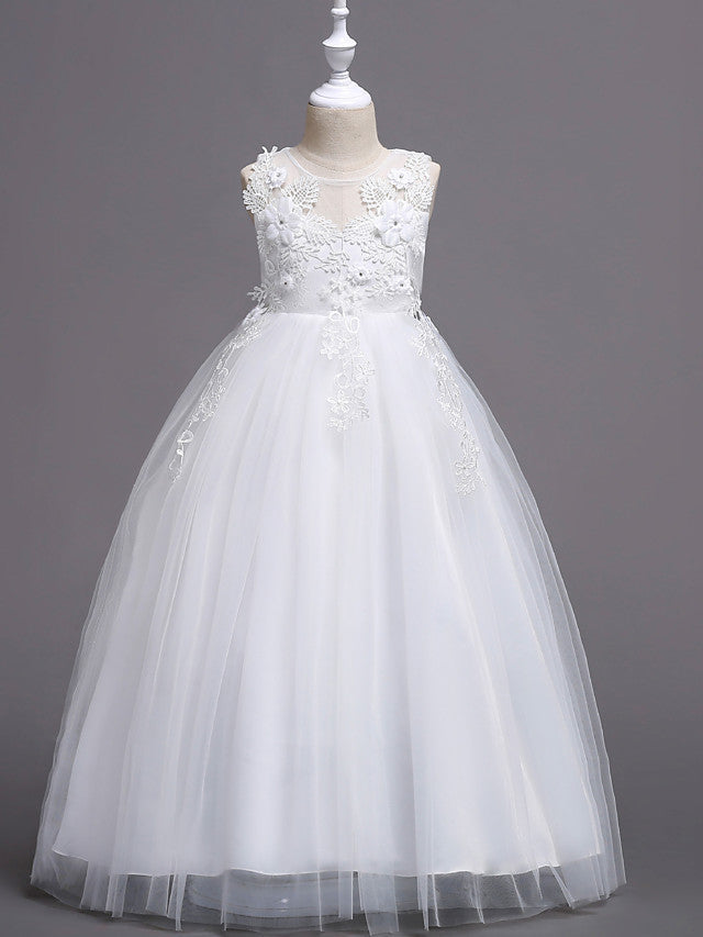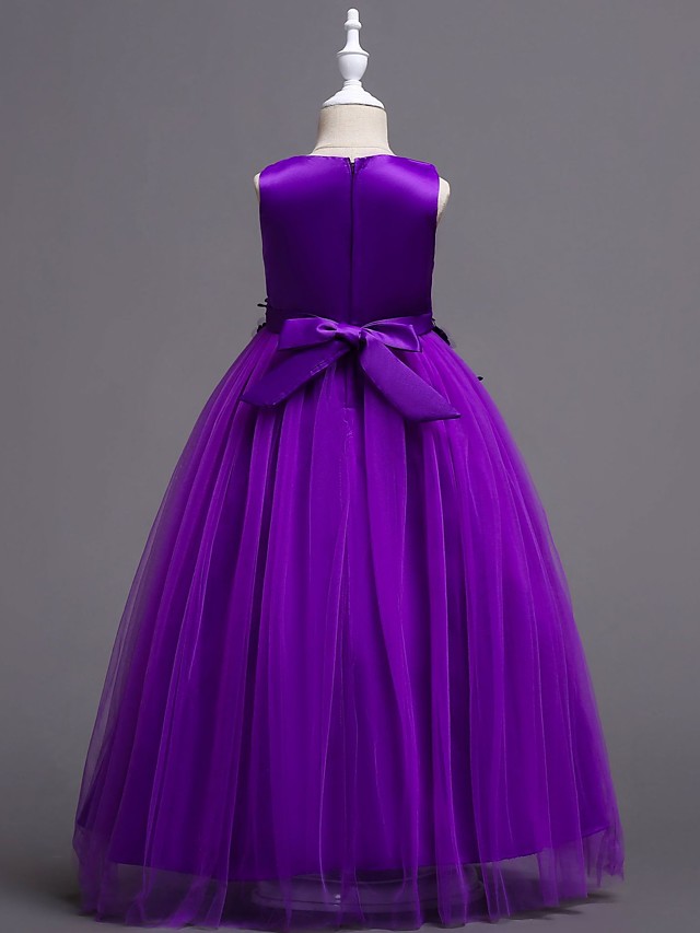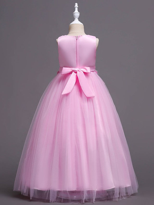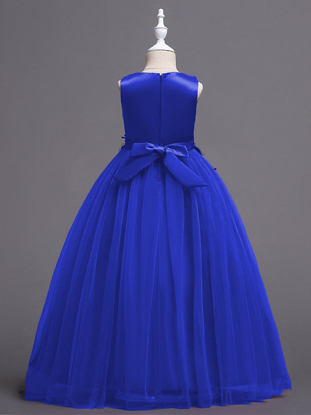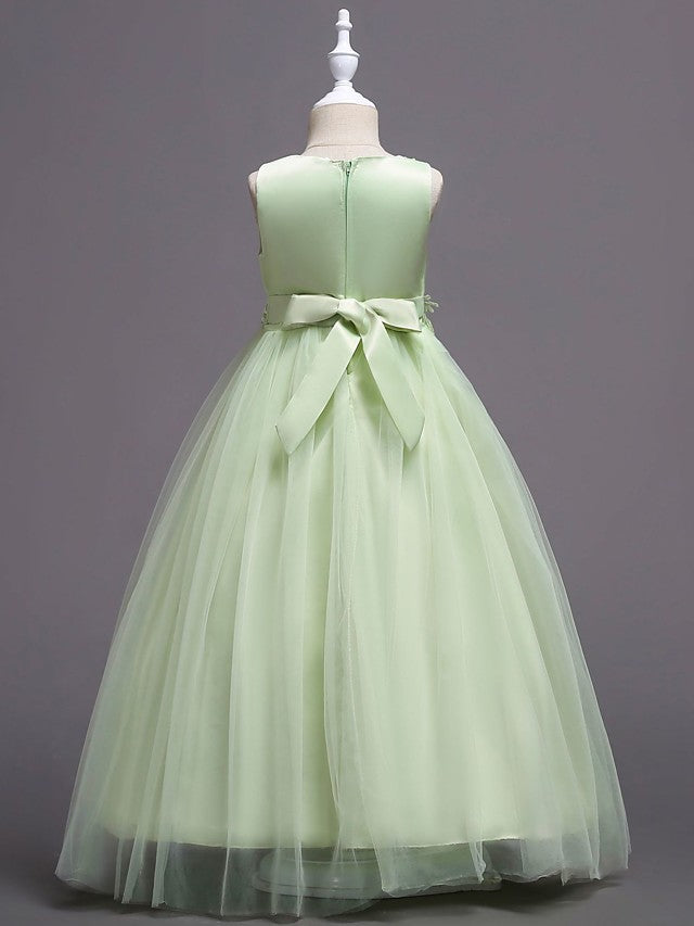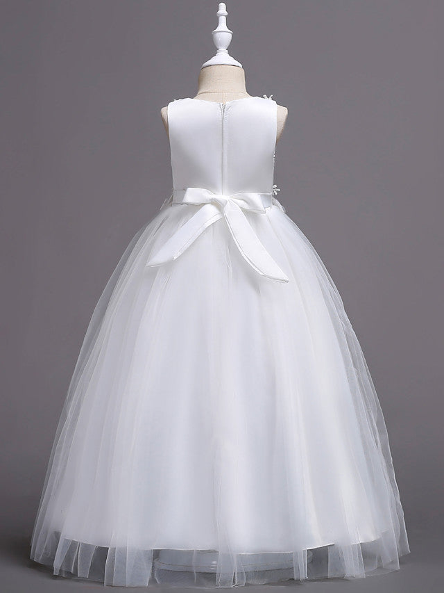 Long Princess Satin Tulle Jewel Neck Wedding First Communion Flower Girl Dresses